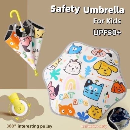 반사 스트립이 있는 안전 어린이 우산 재미있는 바퀴가 있는 귀여운 둥근 모서리 우산 UPF50+ Anti-UV Sun Rain Parasol