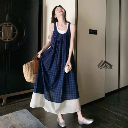 여성 여름 핀턱 주름 민소매 롱 드레스 캐주얼 휴가 탱크 드레스