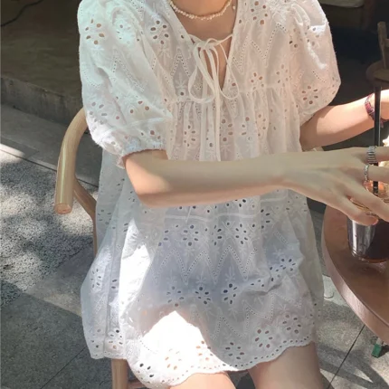 여성용 할로우 아웃 퍼프 슬리브 블라우스, 올매치 원피스 레이스, V넥, 얇은 여름 루즈 패션, 솔리드 심플 캐주얼 여성