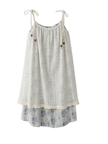 여름 신상 레이스 스플라이싱 매듭 미디 기장 홀터넥 드레스 여성용 스윗 루즈핏 허리 A라인 스커트 스타일 폴리에스터 소재