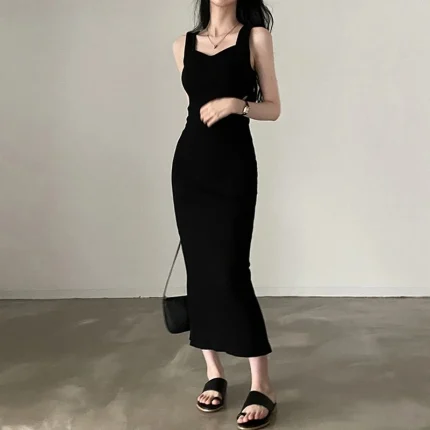 Myufon 기본 니트 롱 드레스 한국 패션 스퀘어 칼라 민소매 여성 드레스 여름 캐주얼 Y2k 빈티지 All-match Outftis
