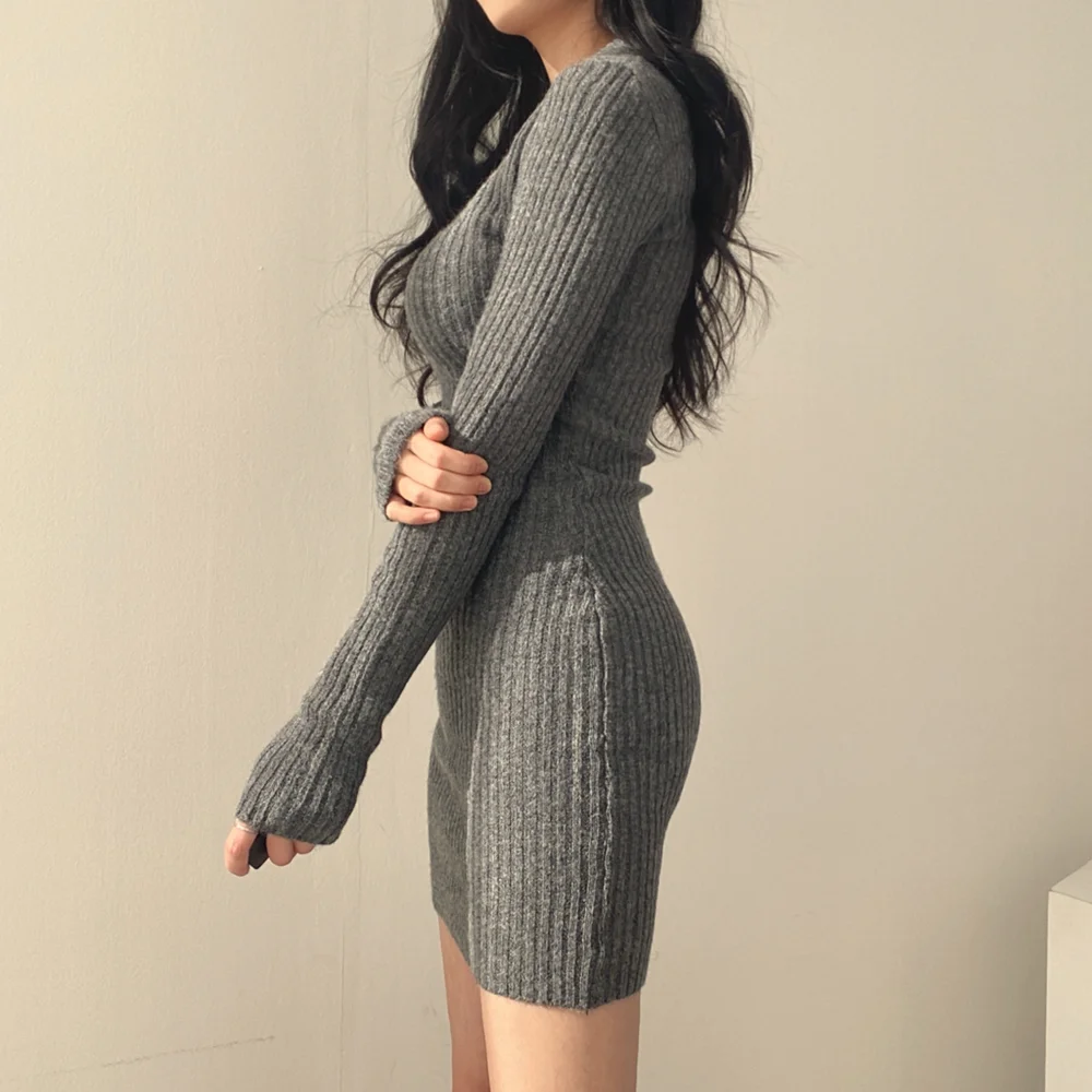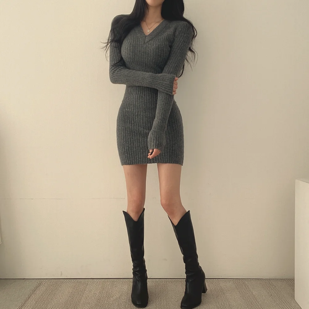 가을 겨울 여성용 짧은 니트 드레스 슬림핏 V넥 이너웨어 그레이 랩스커트 출퇴근 스타일 유니폼 바디타입