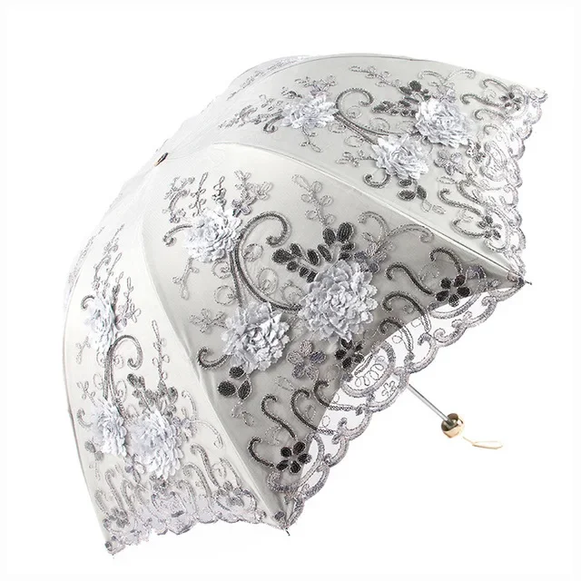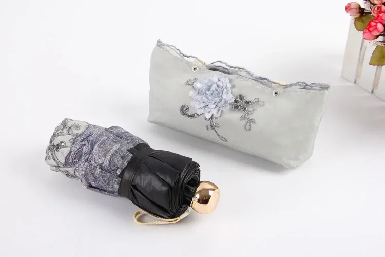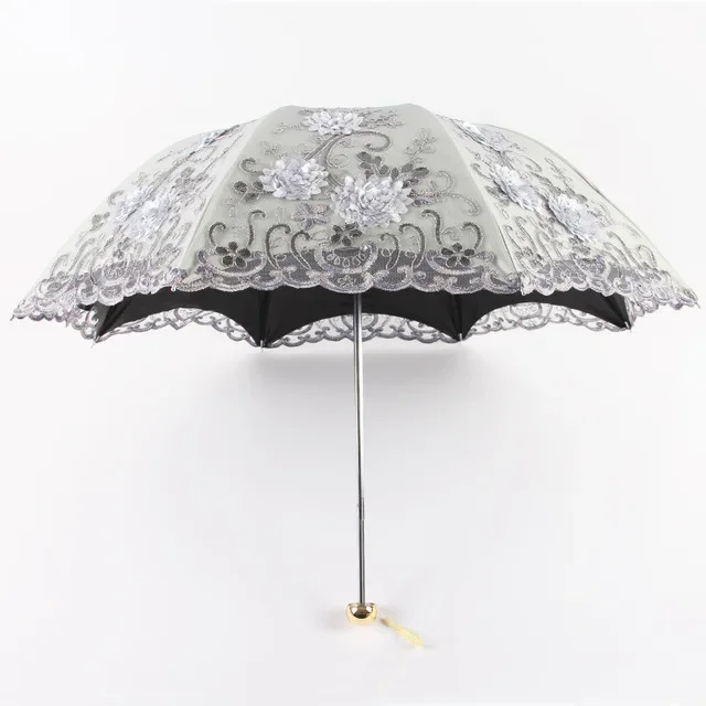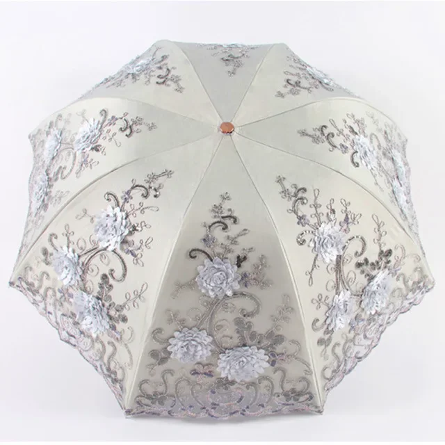 여성을위한 꽃 자수 레이스 비 태양 우산 휴대용 3 배 UV 더블 레이어 우산 여성을위한 절묘한 파라솔 선물