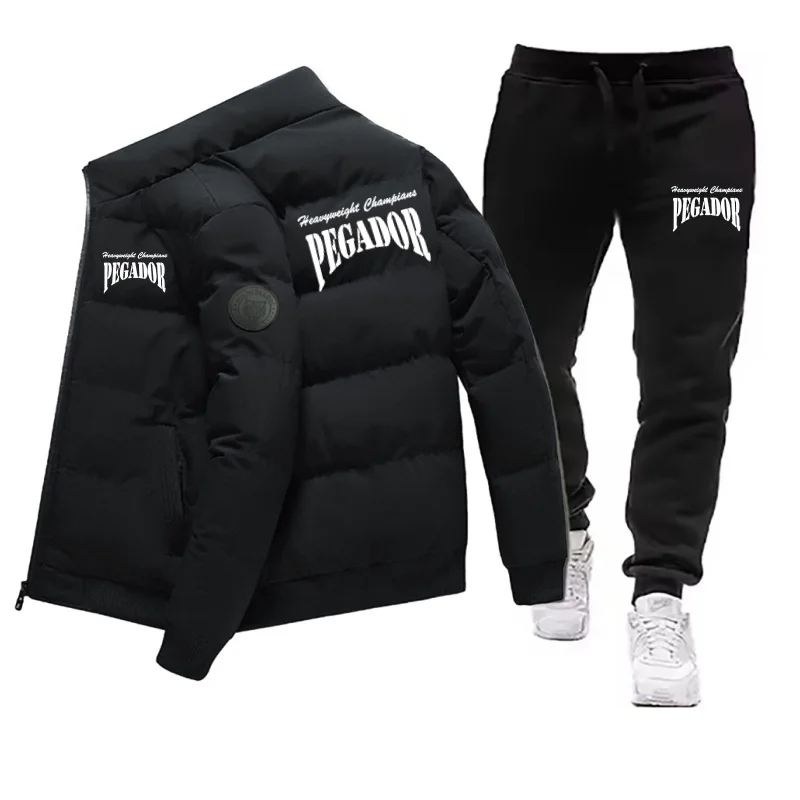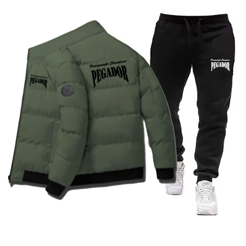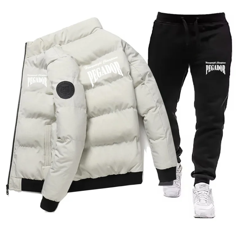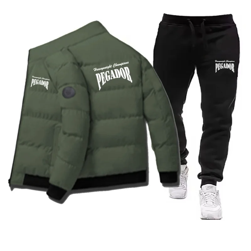 남성용 겨울 따뜻한 면 재킷+드로스트링 바지 세트 새로운 패셔너블 캐주얼 스포츠 파이크 다운 아웃도어 방풍 재킷 세트