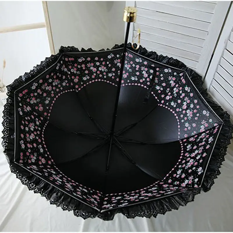 레이스 플라워 여성용 자외선 차단 파라솔, 휴대용 컴팩트 블랙 코팅, 안티 UV 비 우산, 소녀 공주 차양 빈티지