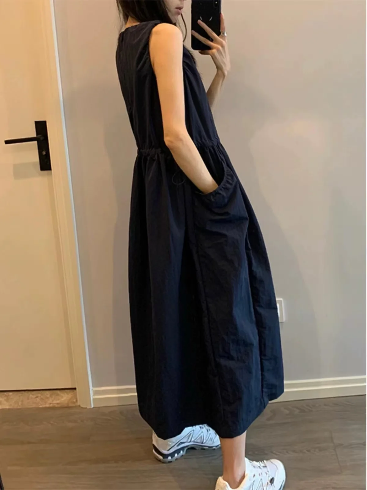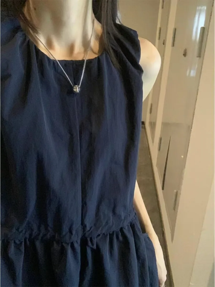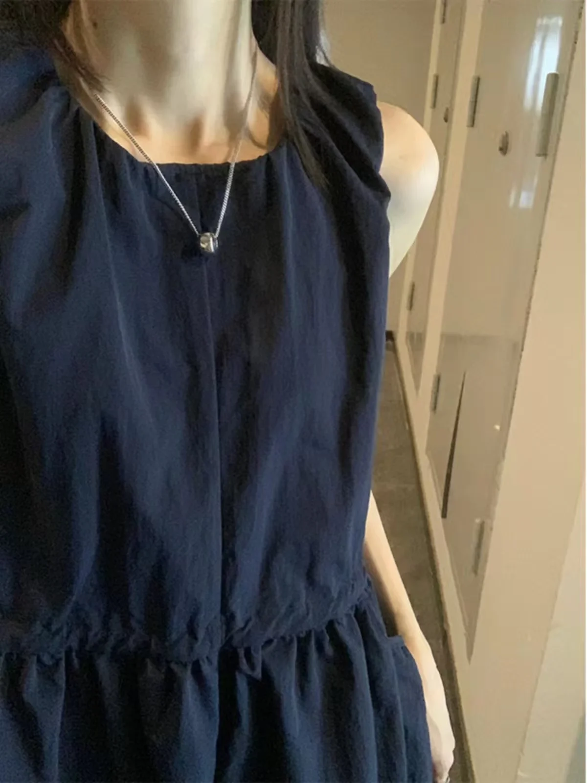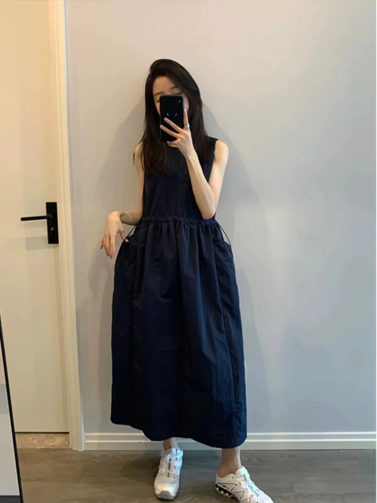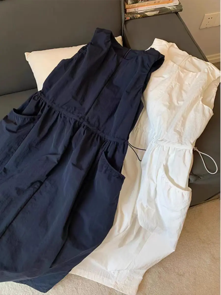 루즈핏 프록 드레스 여성 여름 신상 한국 디자인 감각 플리츠 허리끈 조절 베스트 드레스 캐주얼 라운드넥 반팔