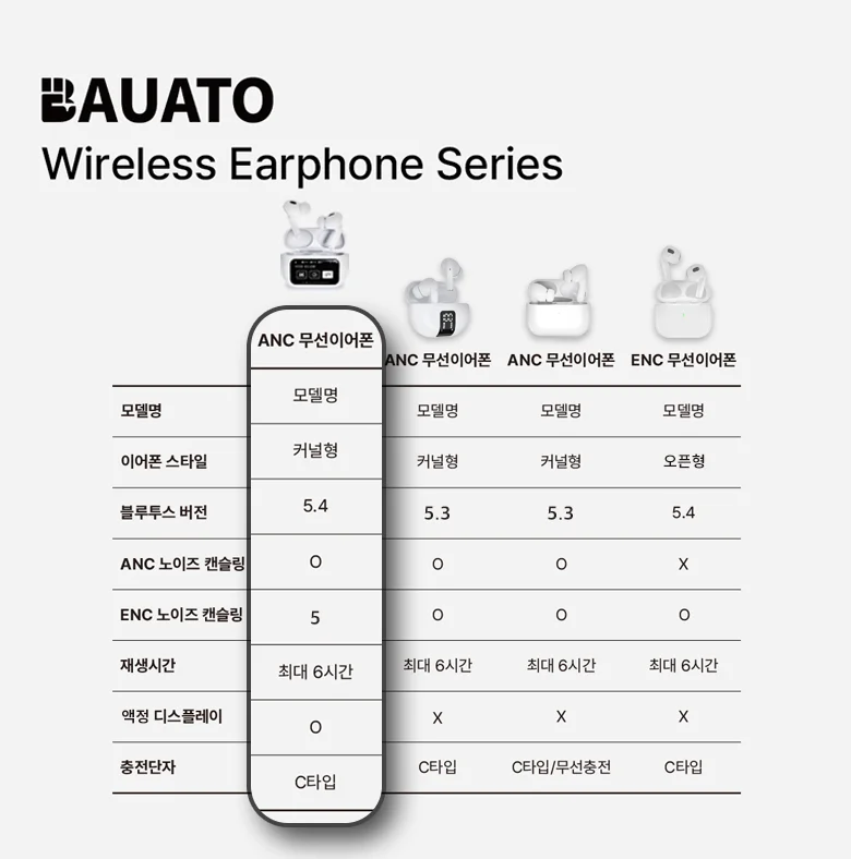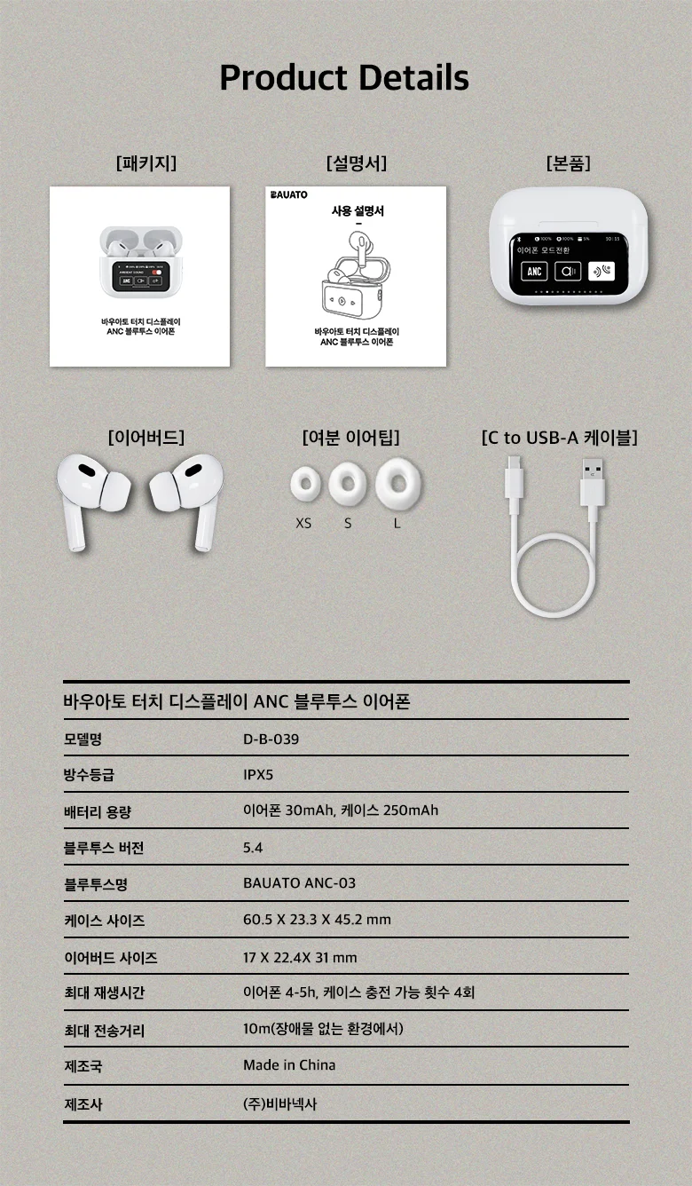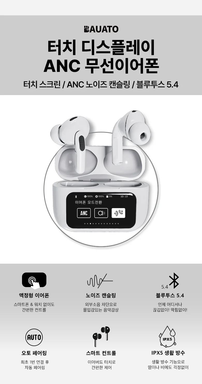 [블루투스 5.4] 바우아토 ANC 액정형 노이즈 캔슬링 무선 블루투스 5.4 이어폰 noise canceling wireless