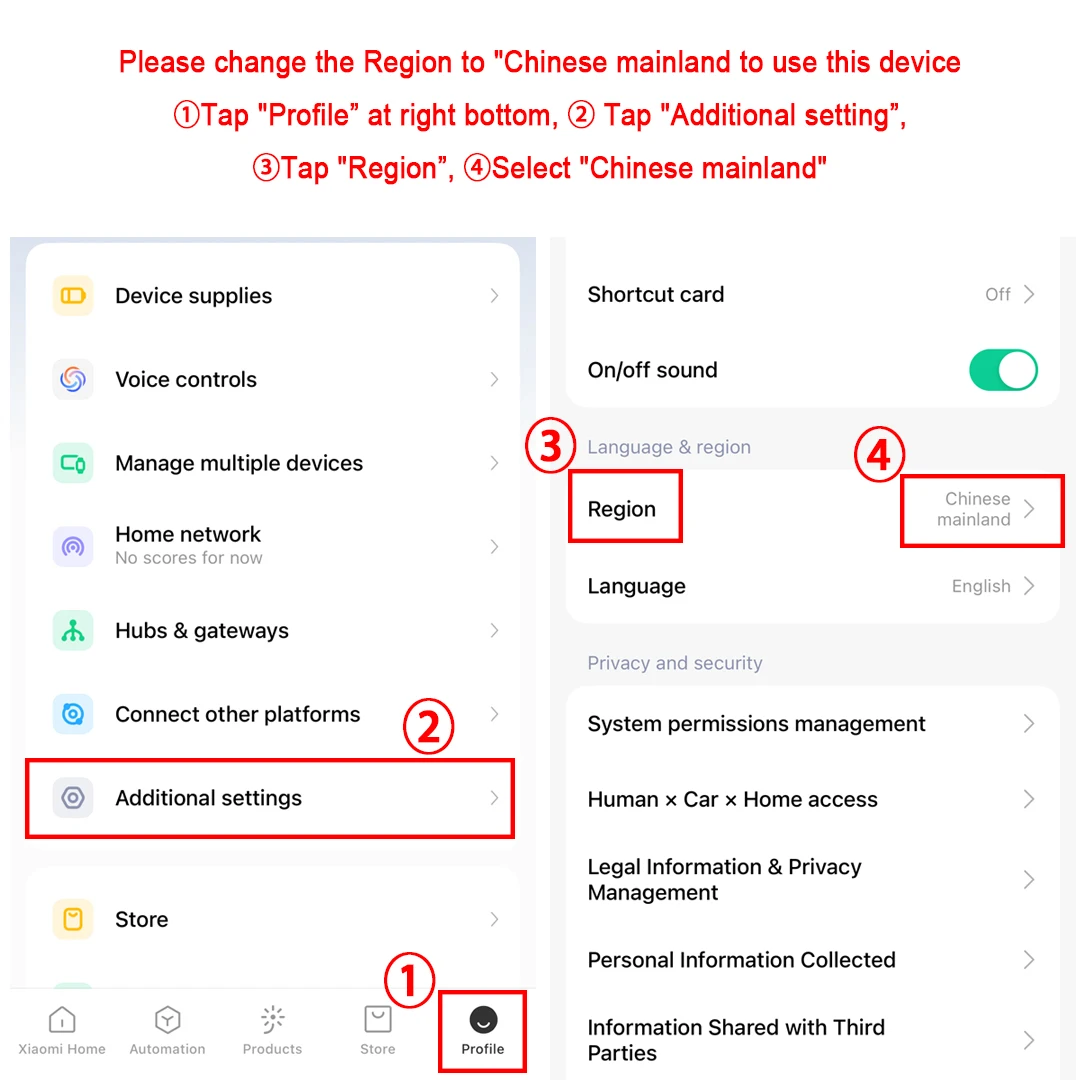 2. Mi Home 앱 연결에 실패하면 앱에서 지역을 중국 본토로 변경해야 합니다.