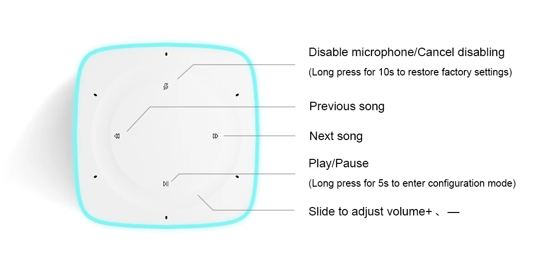 스피커 본체의 조작은 주로 상단 표면에 집중되어 있으며, 여기에는 재생/일시 정지, 다음 곡, 이전 곡, 마이크 비활성화 등 4개의 터치 버튼과 전체 볼륨 링이 포함됩니다.시계 방향으로 밀면 볼륨이 증가하고, 시계 반대 방향으로 밀면 볼륨이 증가합니다.볼륨을 줄이기 위해 볼륨 링은 약간 오목한 광택 표면으로 설계되어 슬라이딩 댐핑을 더욱 편안하게 할 뿐만 아니라 기능적 파티션을 빠르게 찾는 느낌을 도와줍니다.