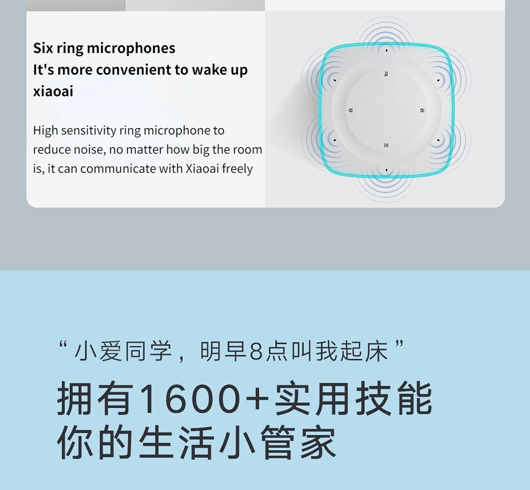 볼륨 링 외부에는 동일한 링에 분산된 6개의 고감도 마이크가 있어 사용자가 시끄러운 환경과 넓은 공간에서도 쉽게 Xiao Ai를 깨우고 음성 명령을 내릴 수 있습니다.