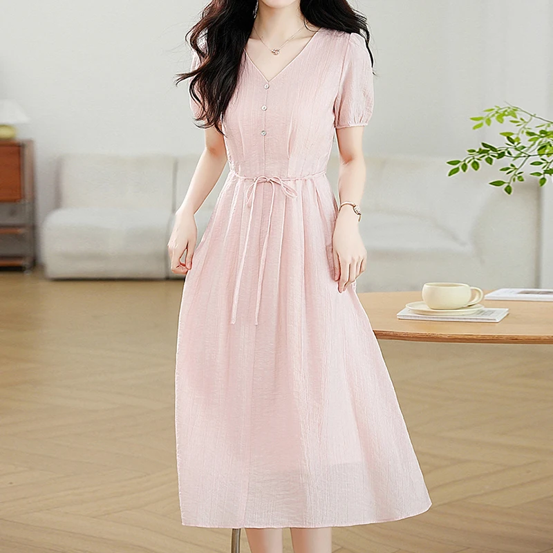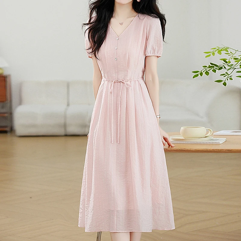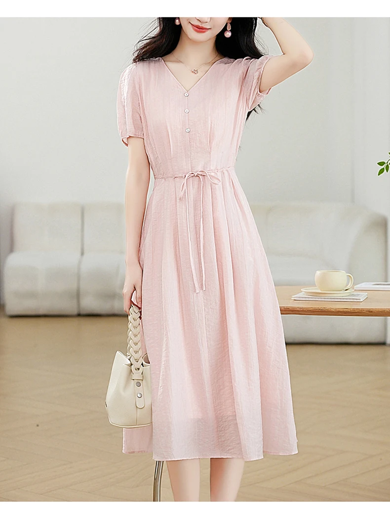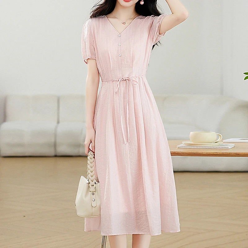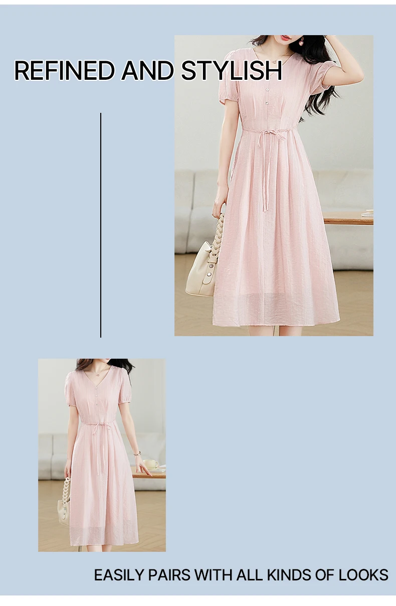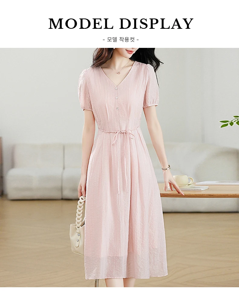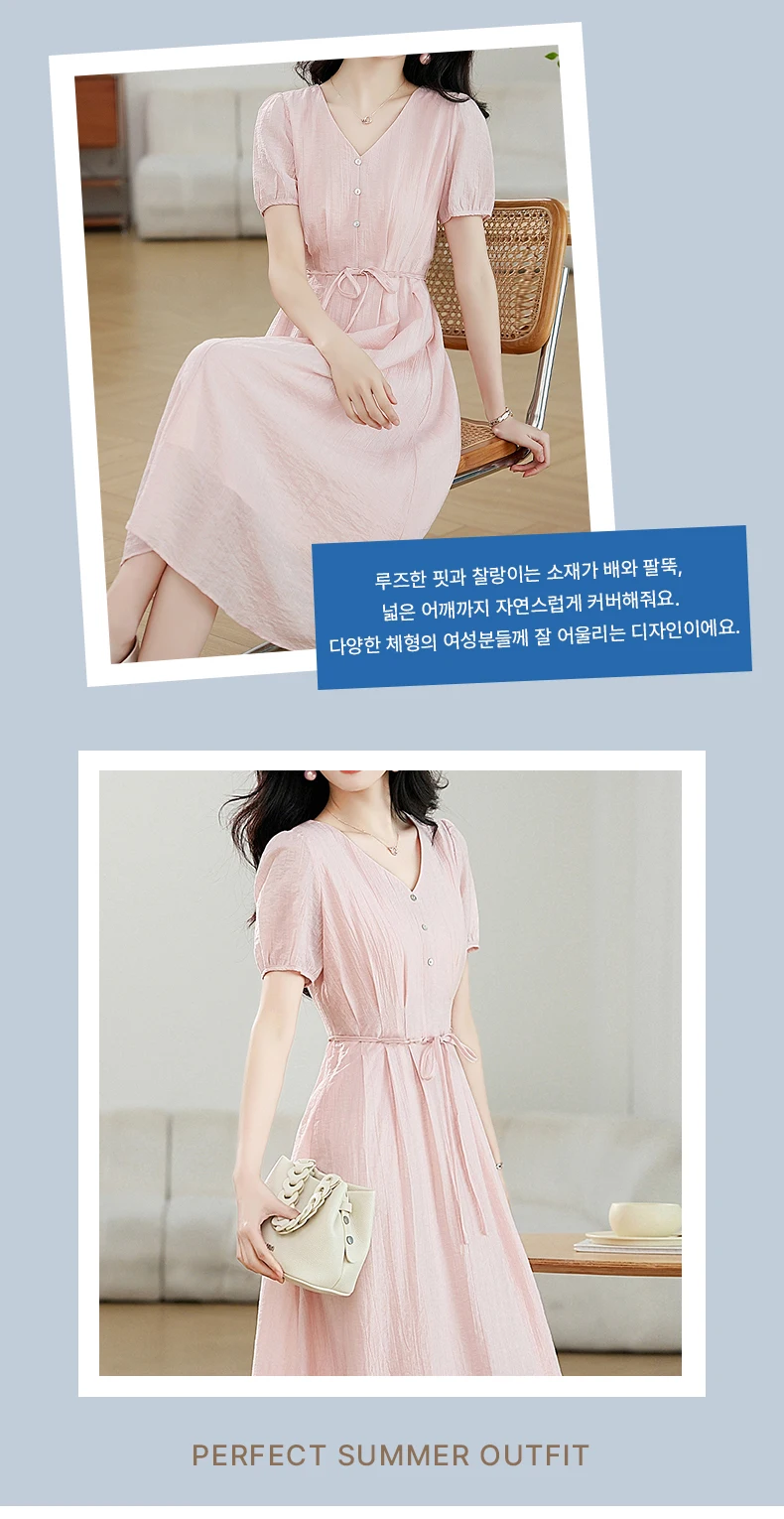 스타일아유 고급무드 여성용 브이넥 리본 스트랩 미디 원피스 깔끔한 데일리룩 OP2281