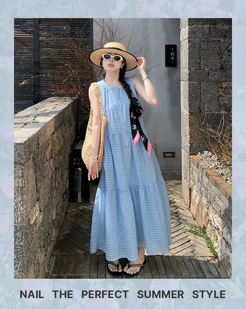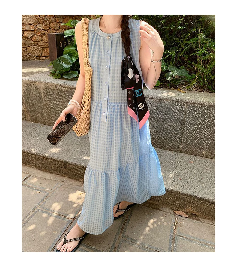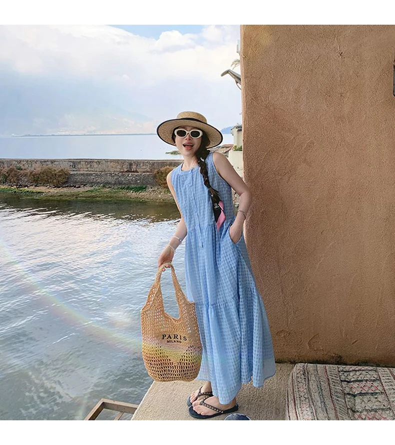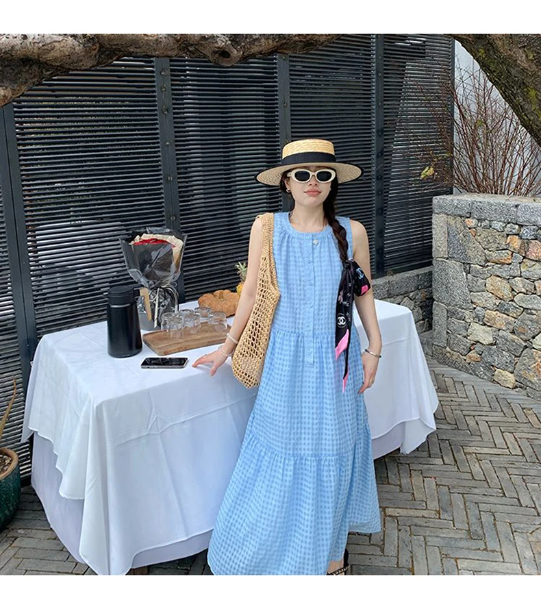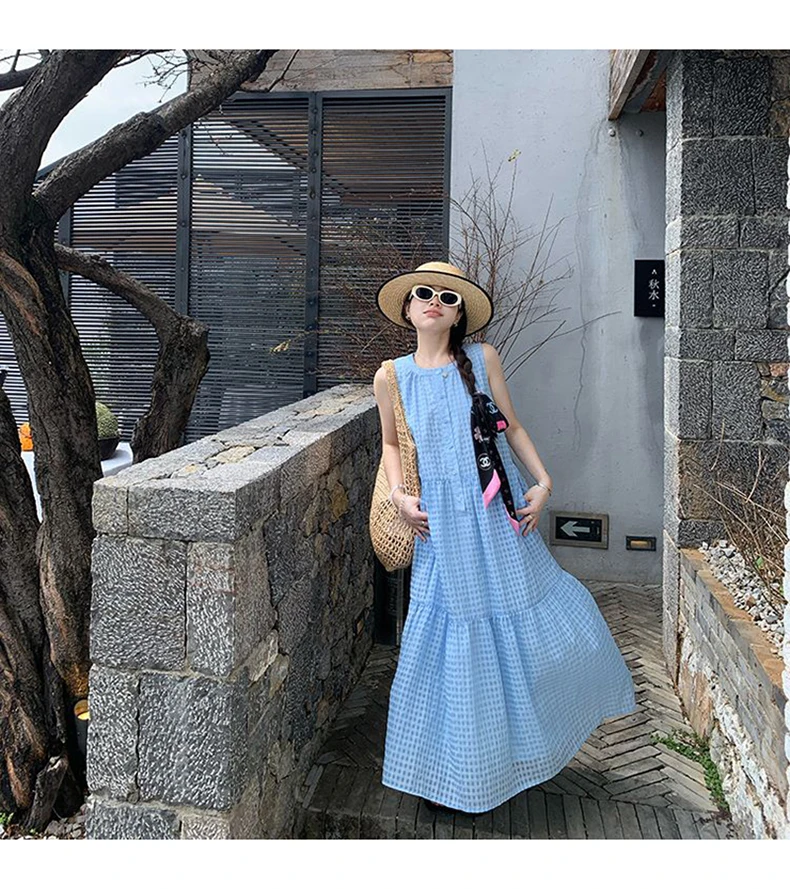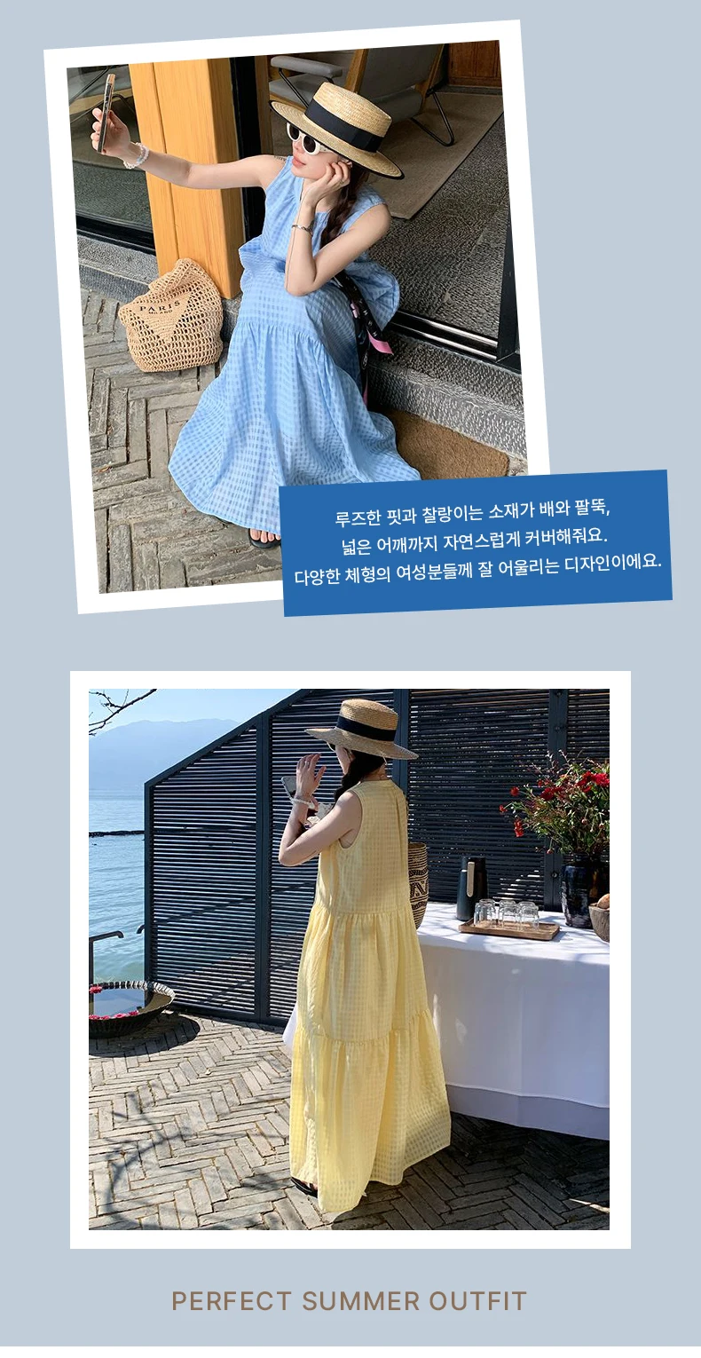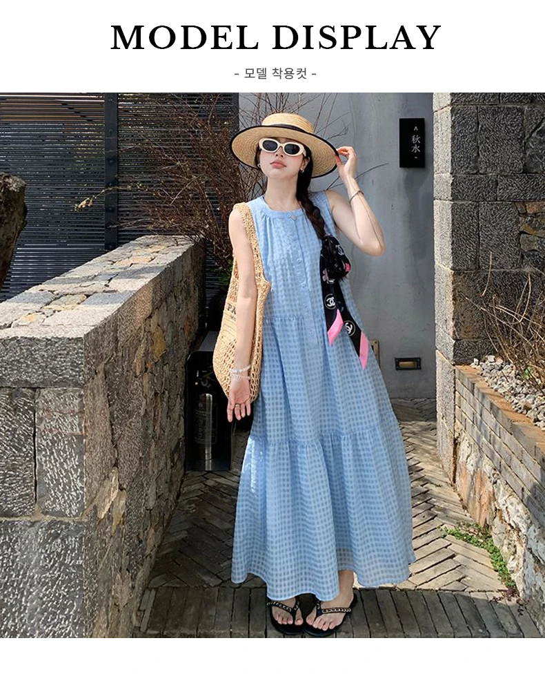 스타일아유 여성 체크 패턴 롱 A라인 슬리브리스 드레스 루즈핏 여름 나시원피스 휴양지룩 OP2290
