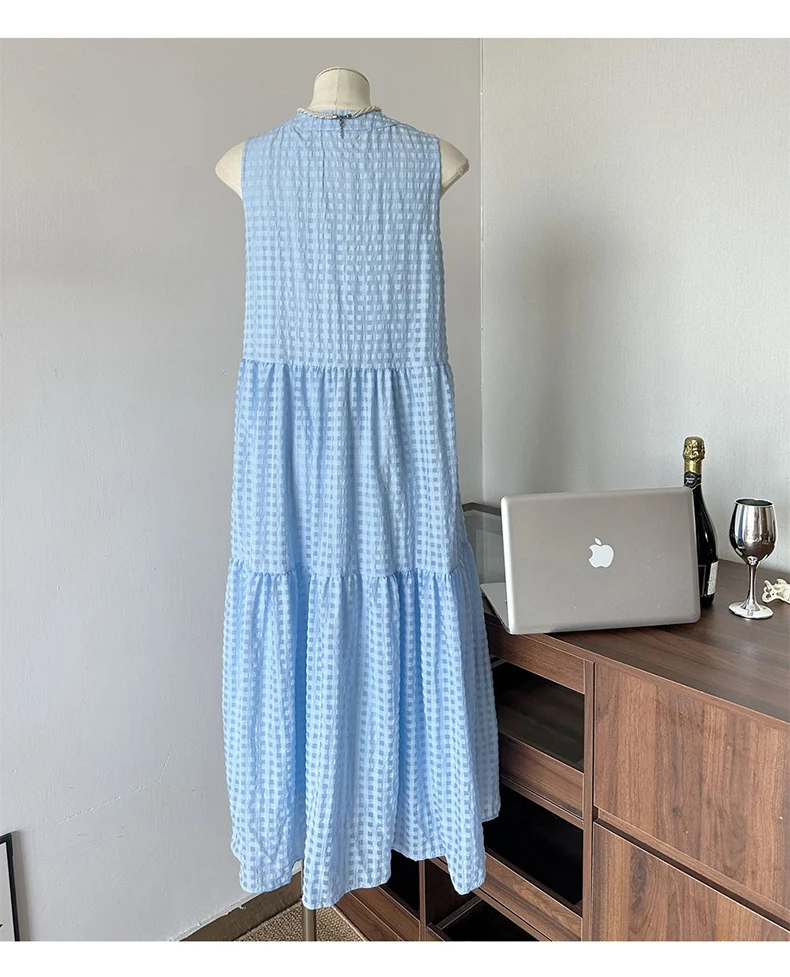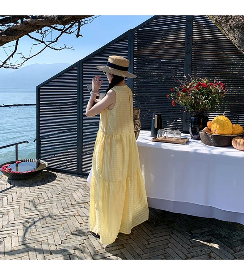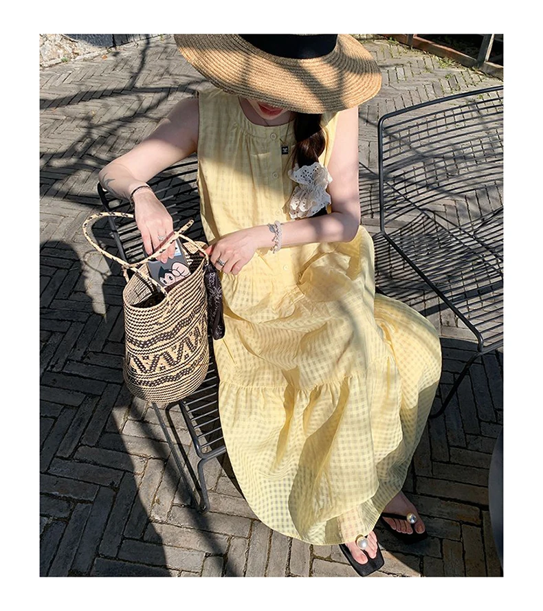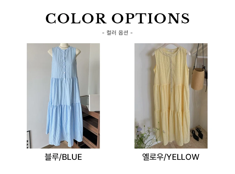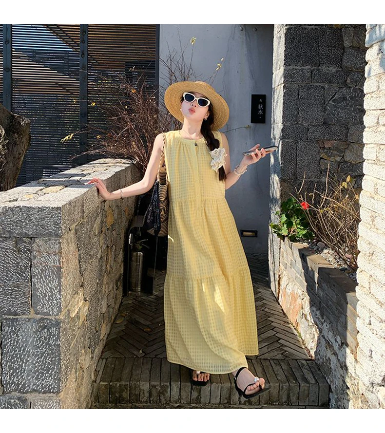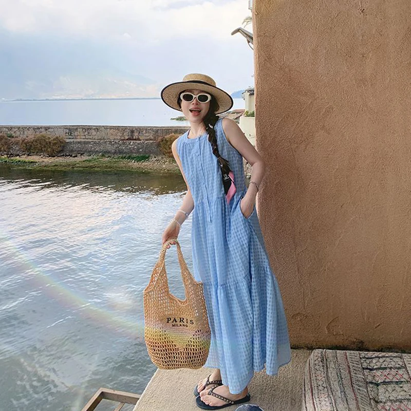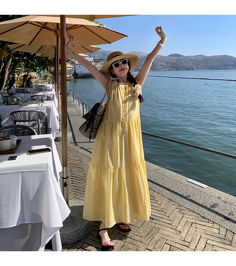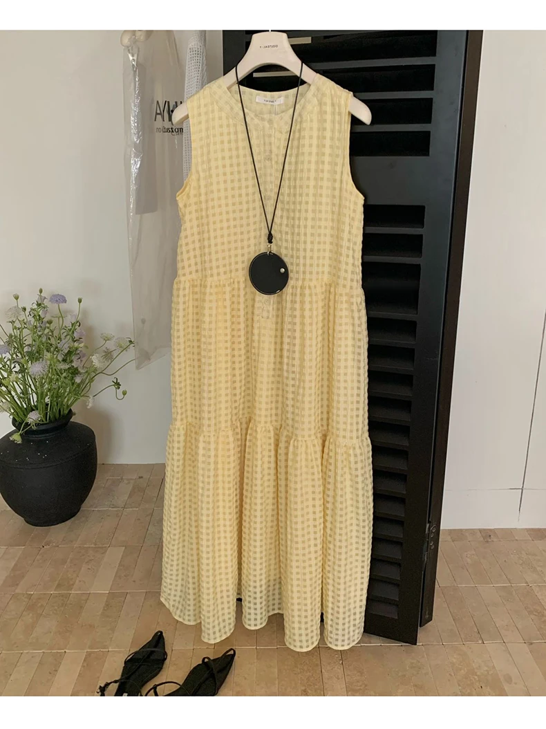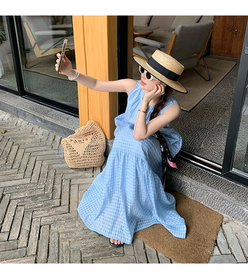 스타일아유 여성 체크 패턴 롱 A라인 슬리브리스 드레스 루즈핏 여름 나시원피스 휴양지룩 OP2290