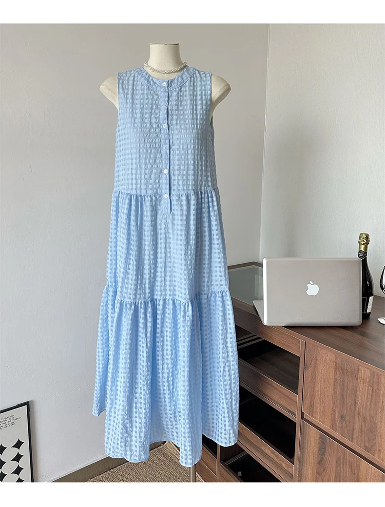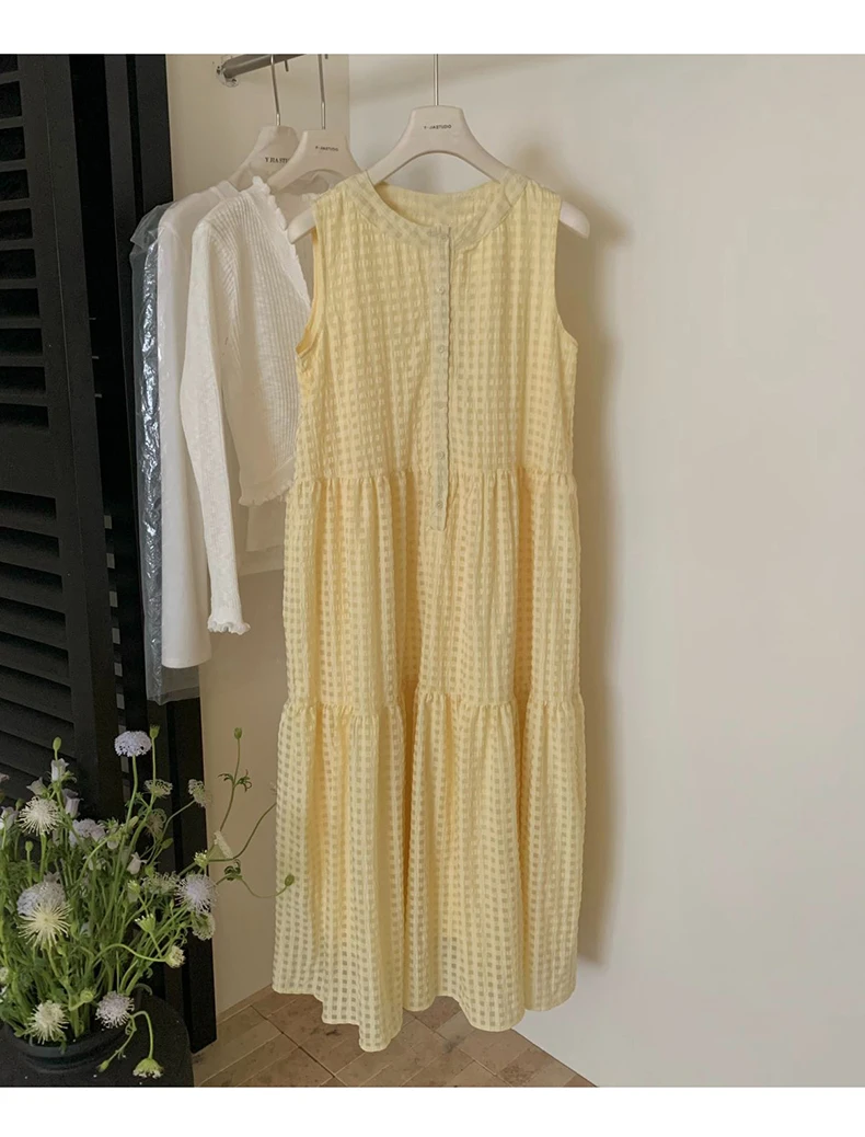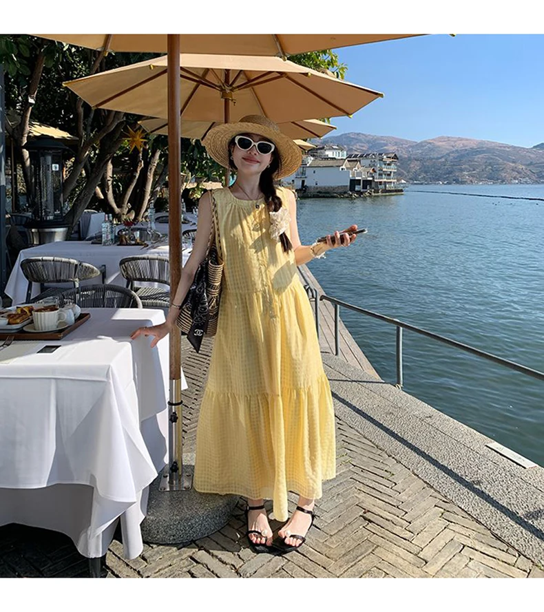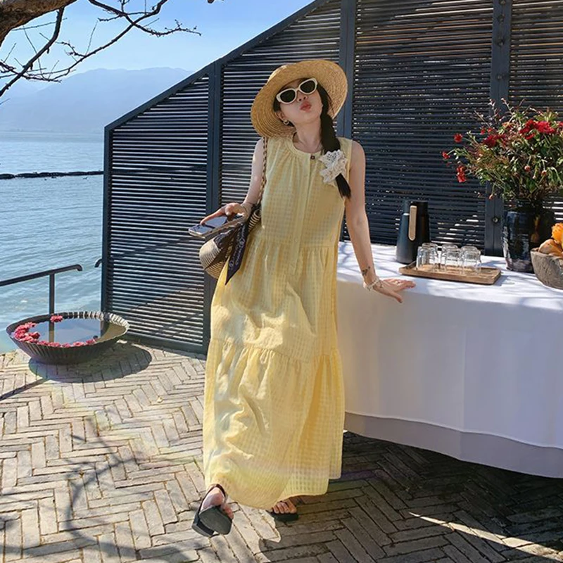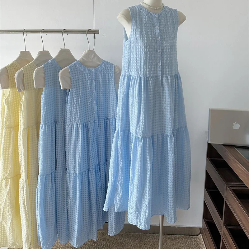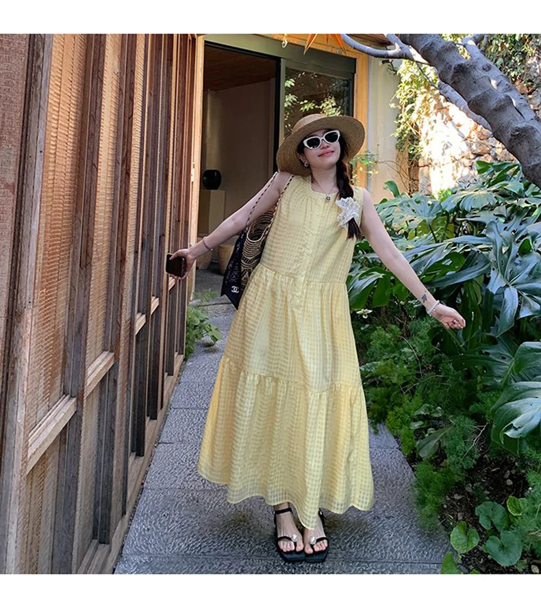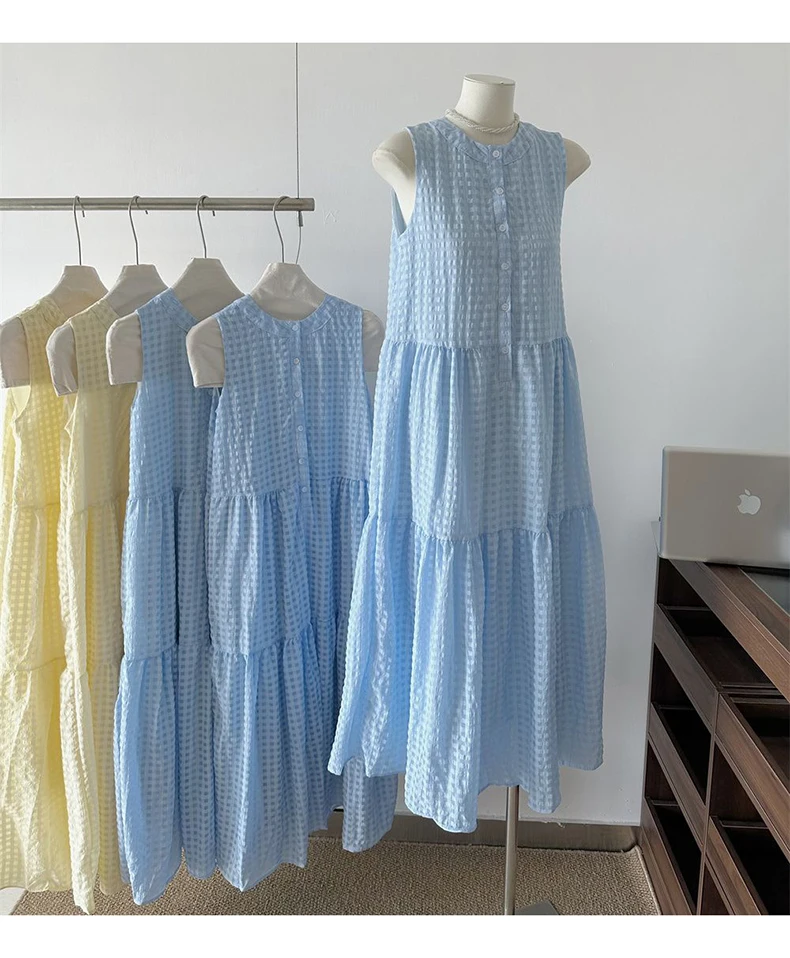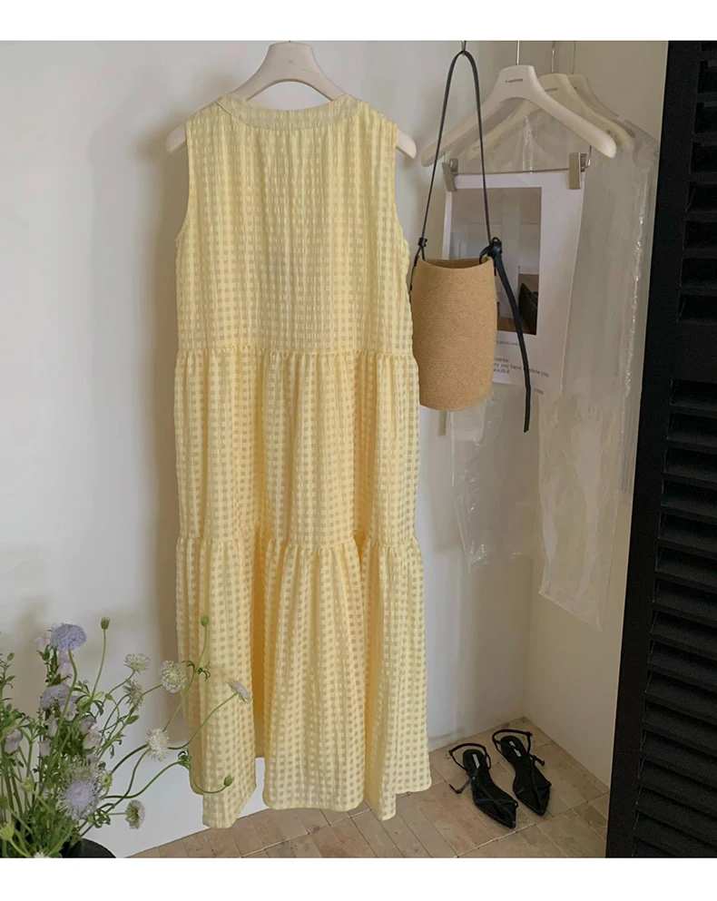 스타일아유 여성 체크 패턴 롱 A라인 슬리브리스 드레스 루즈핏 여름 나시원피스 휴양지룩 OP2290