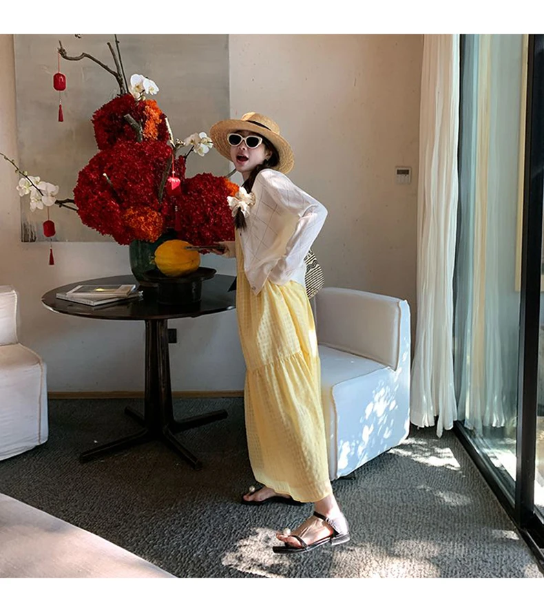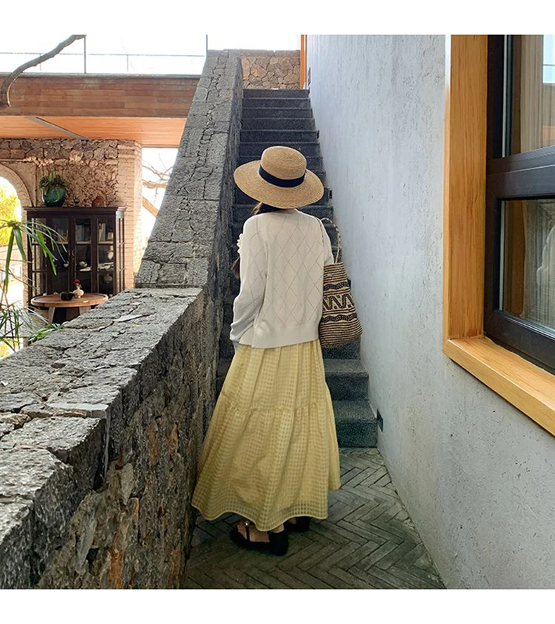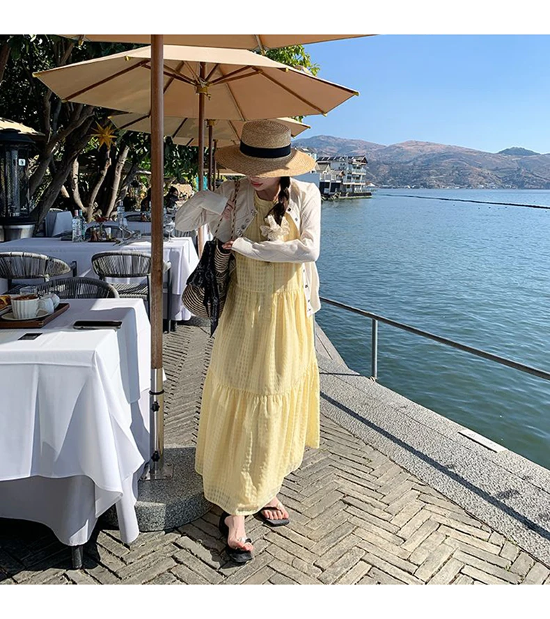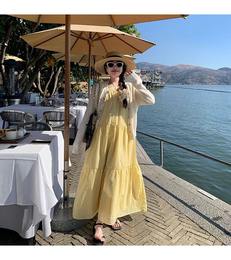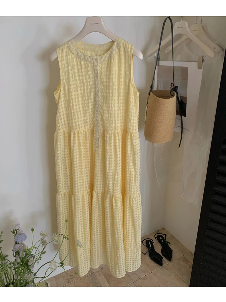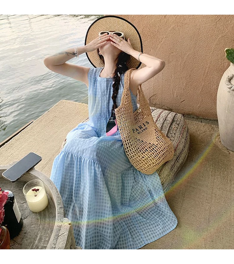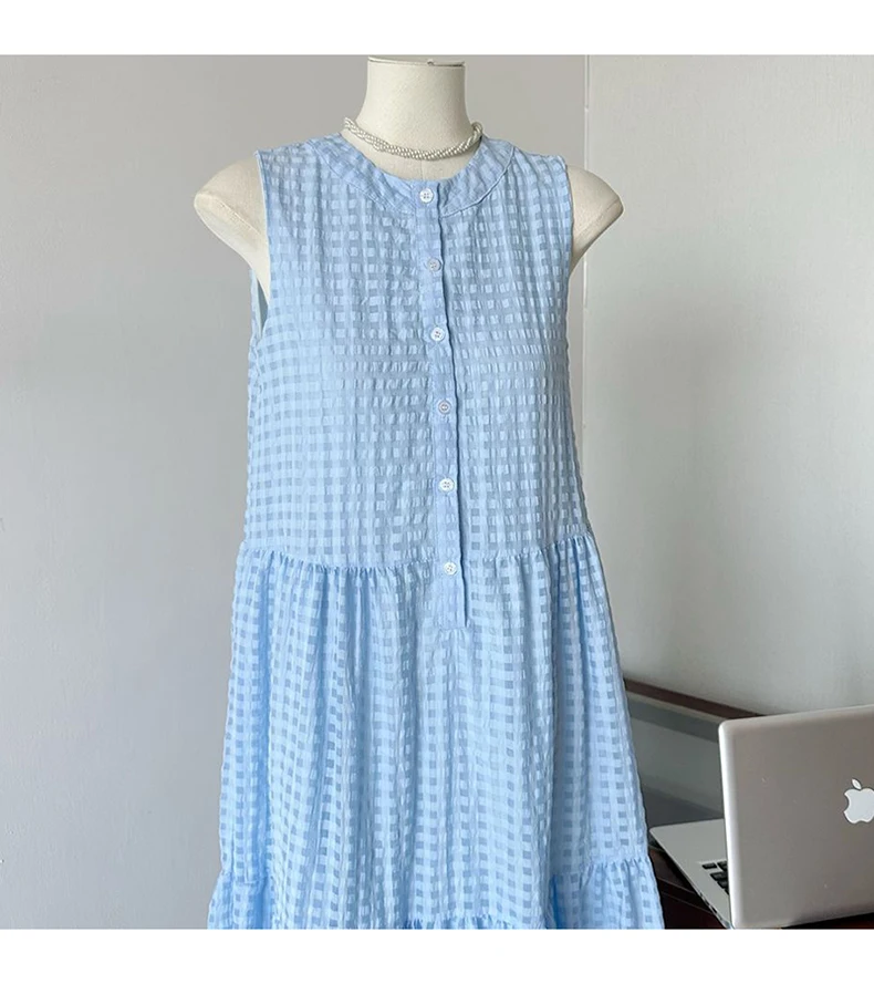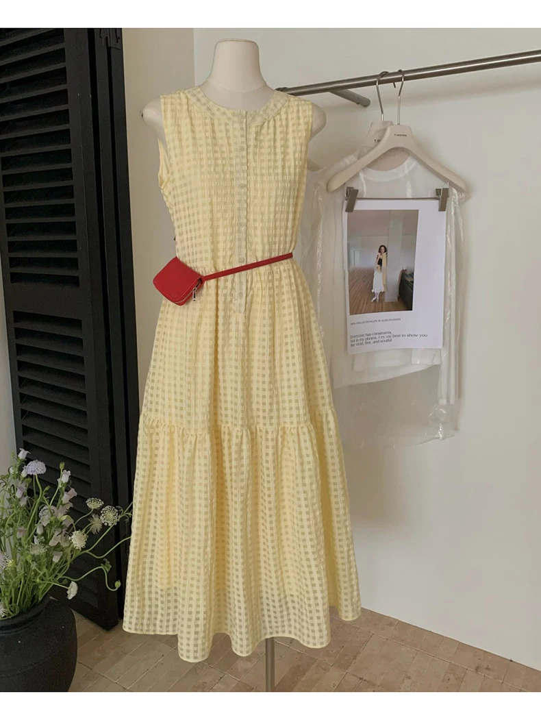 스타일아유 여성 체크 패턴 롱 A라인 슬리브리스 드레스 루즈핏 여름 나시원피스 휴양지룩 OP2290