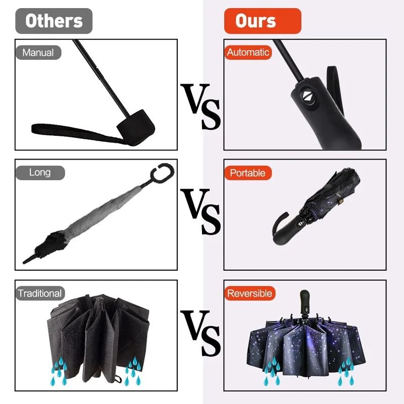 ☂거꾸로 된 우산 젖지 않고 차를 타고 내릴 때, 리버스 디자인은 일반 우산보다 완벽한 개폐 각도로 쉽게 보호 할 수 있기 때문입니다.☂접이식 우산 이 우산은 가까울 때 길이가 13 인치밖에 되지 않는 초소형 사이즈로 접히며, 무게는 1 LB 로 지갑에 완벽하게 들어갈 수 있을 정도로 컴팩트합니다. 핸드백과 배낭 등.☂자동 열기 및 닫기 독특한 디자인으로 한 손가락으로 자동으로 열고 닫을 수 있습니다.☂10 강한 갈비뼈. 슈퍼 방풍, 강한 금속 프레임은 안정성을 높입니다.