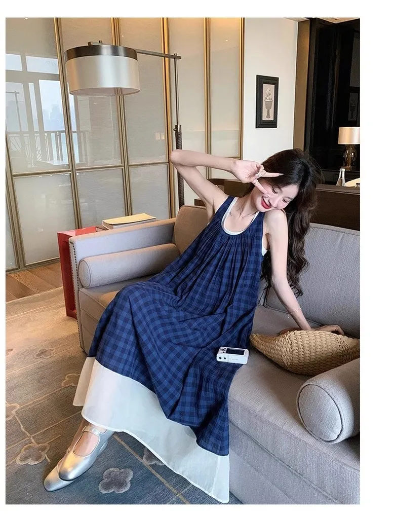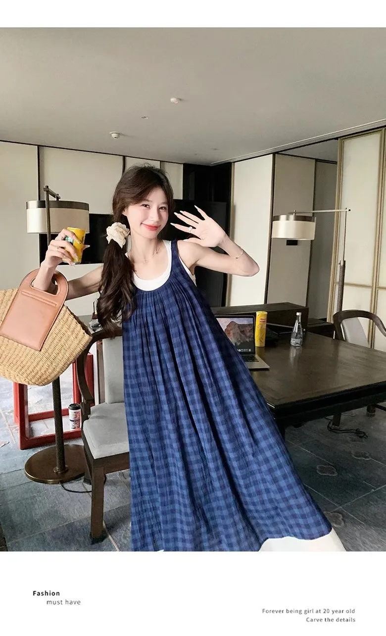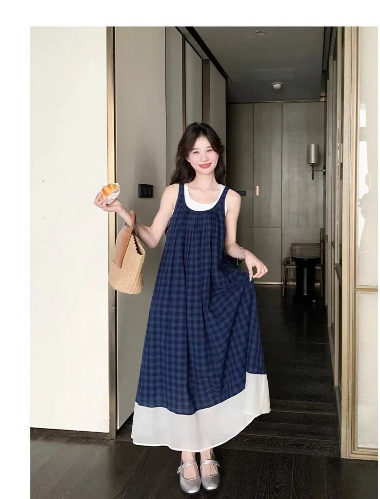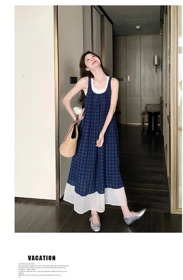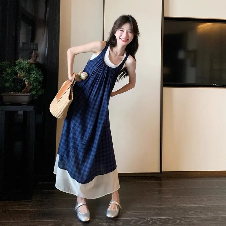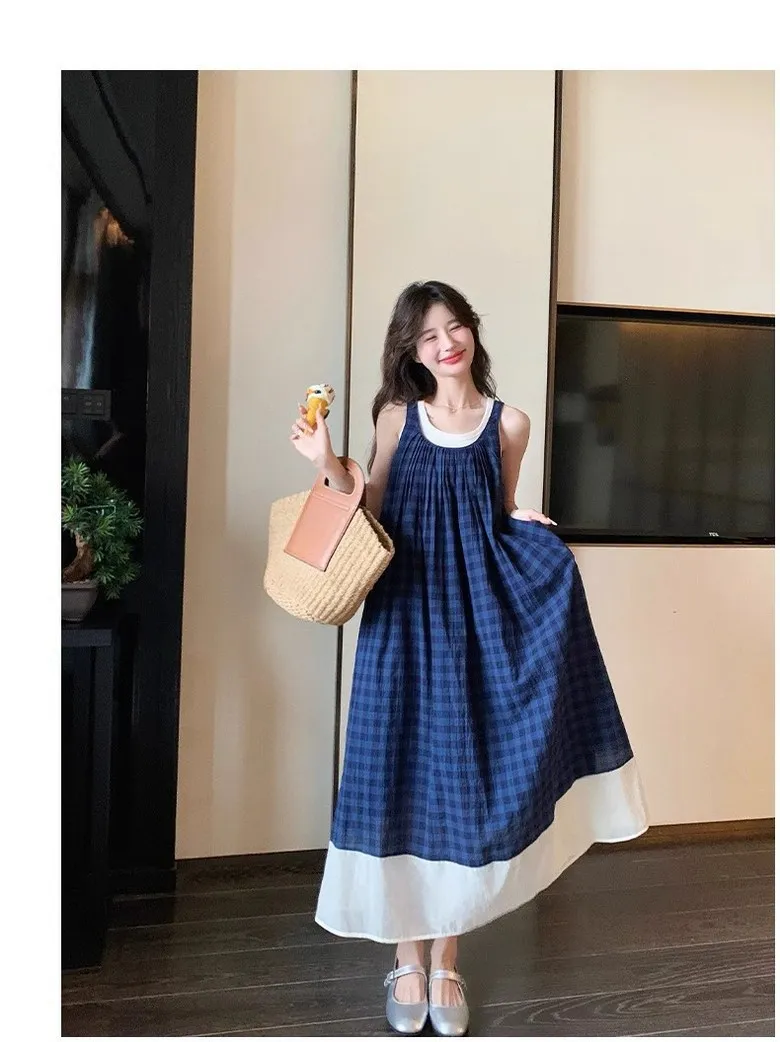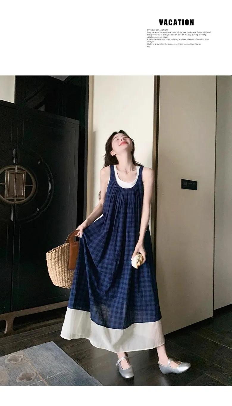 여성 여름 핀턱 주름 민소매 롱 드레스 캐주얼 휴가 탱크 드레스