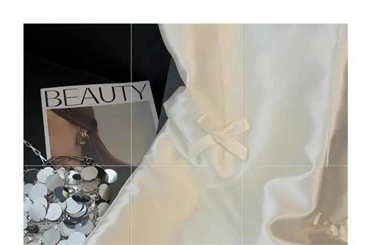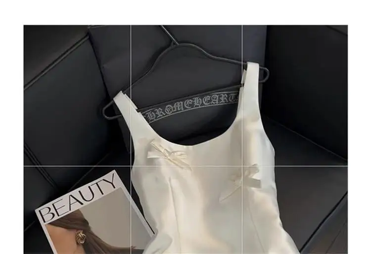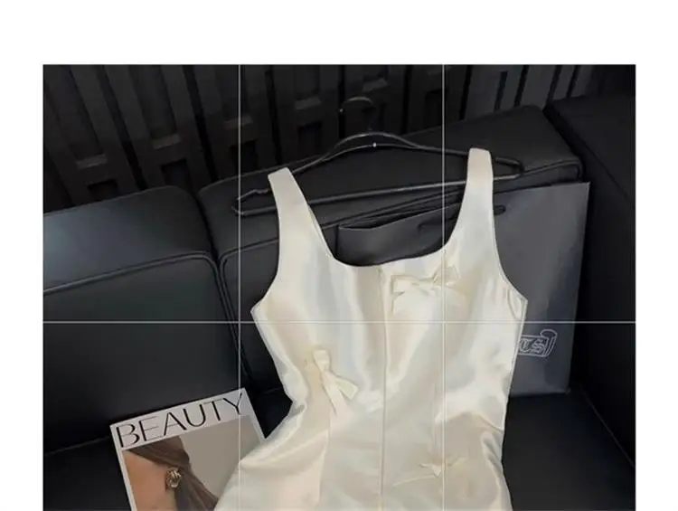 우아한 새틴 나비 매듭 스트랩 드레스 여성용 중간 길이 미디 스커트 화이트 컬러 여름 패션 하이 엔드 느낌 미니 드레스