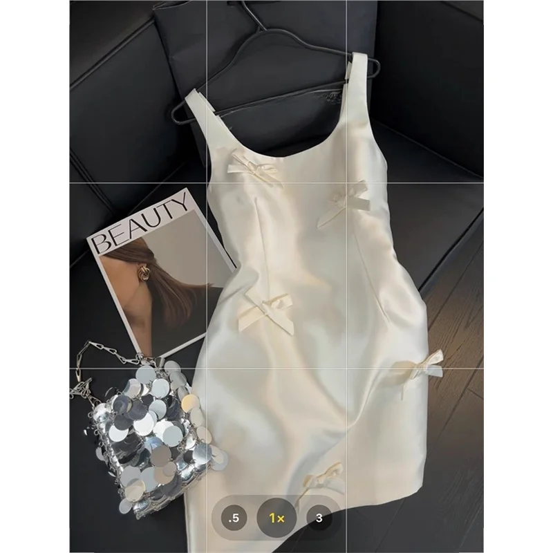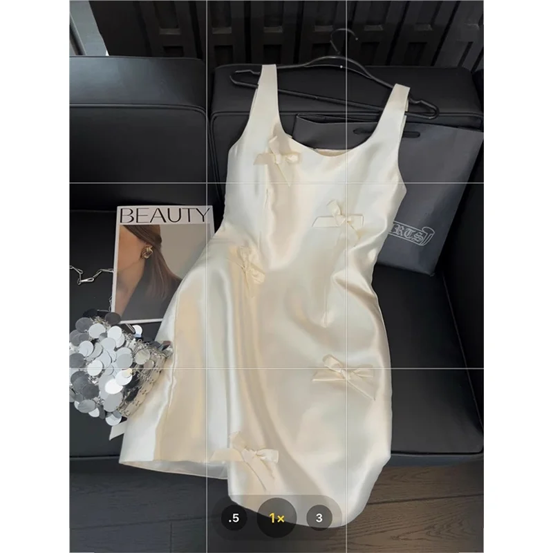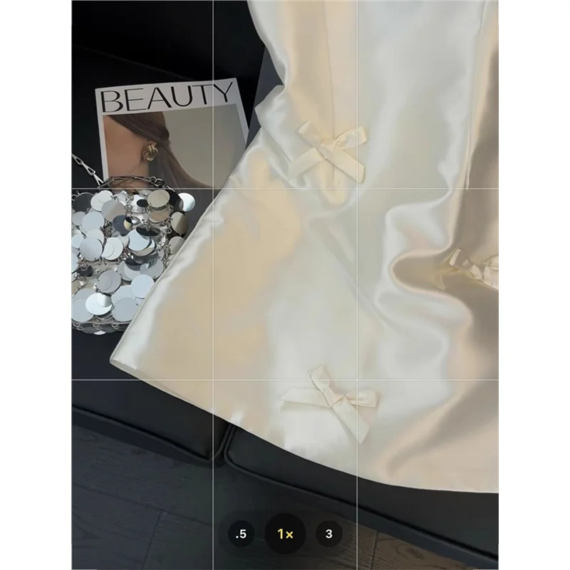 우아한 새틴 나비 매듭 스트랩 드레스 여성용 중간 길이 미디 스커트 화이트 컬러 여름 패션 하이 엔드 느낌 미니 드레스