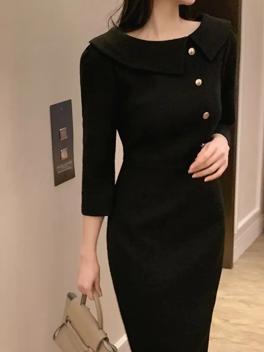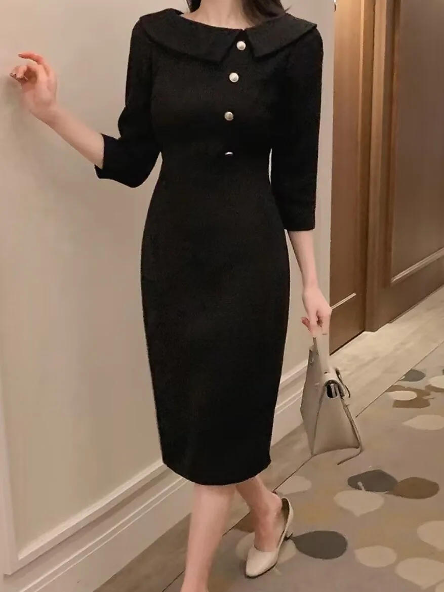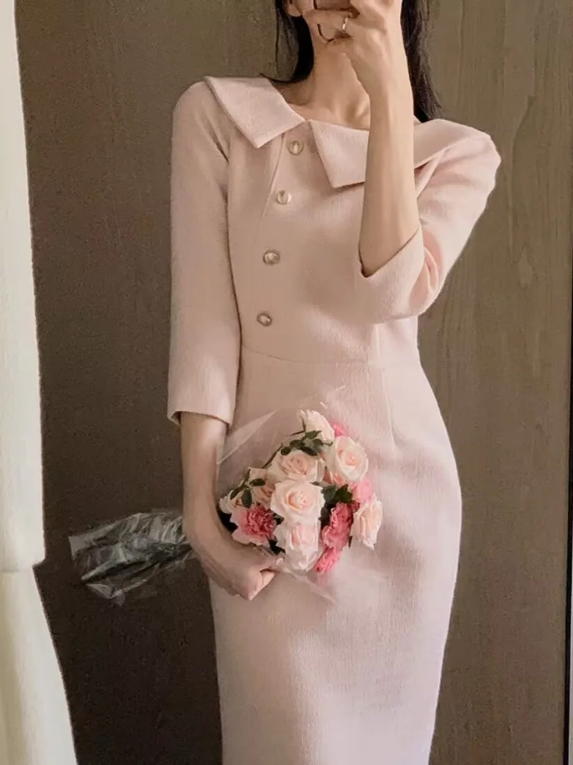 우아한 중간 길이 민소매 여성 드레스 한국 스타일 통근 하이 웨이스트 슬리밍 봄 패션 아이템 싱글 피스