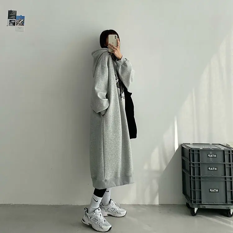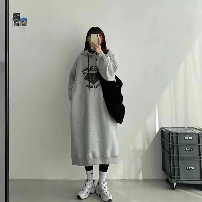 플러스 사이즈 여성용 기모 안감 후드 원피스, 살을 가려주는 레터링, 레이지 스타일, 가을 겨울 루즈핏 원피스, A라인 스커트