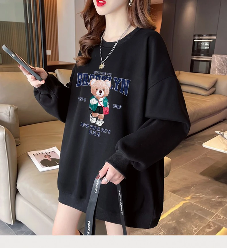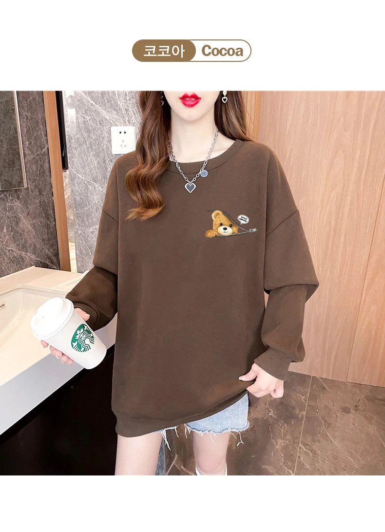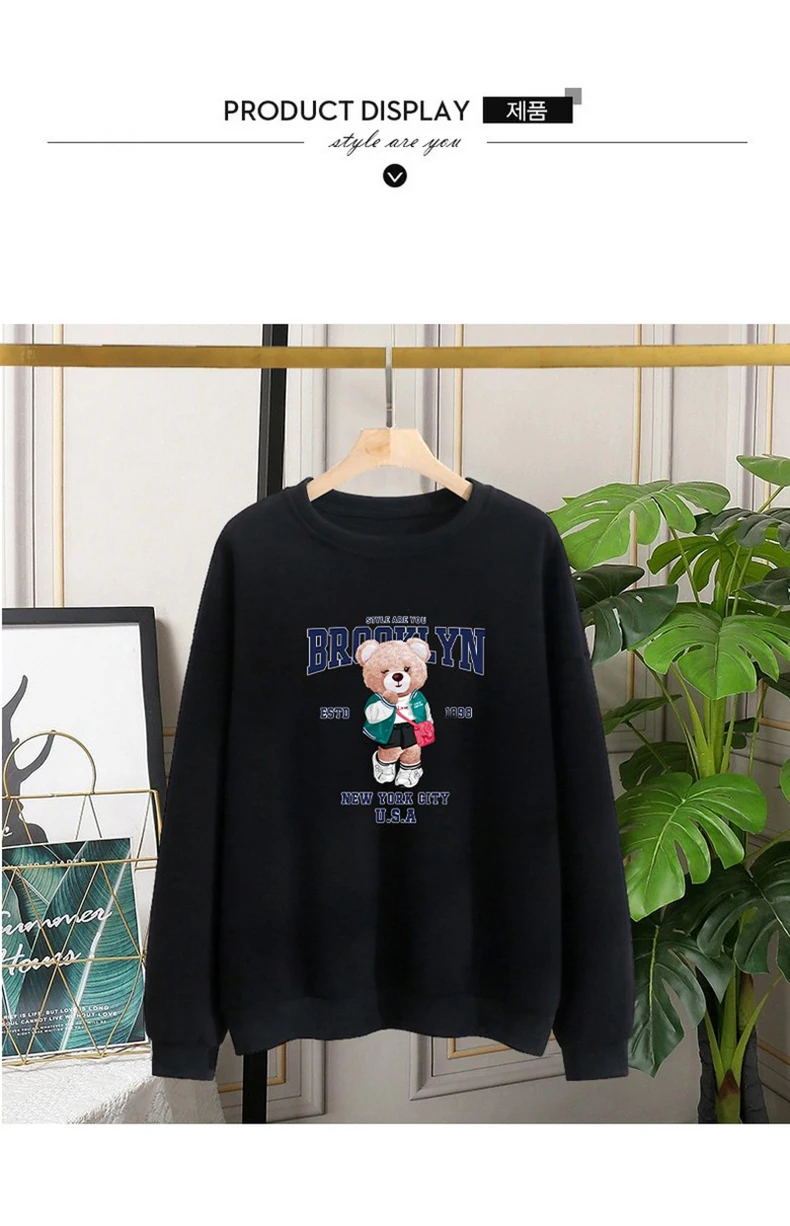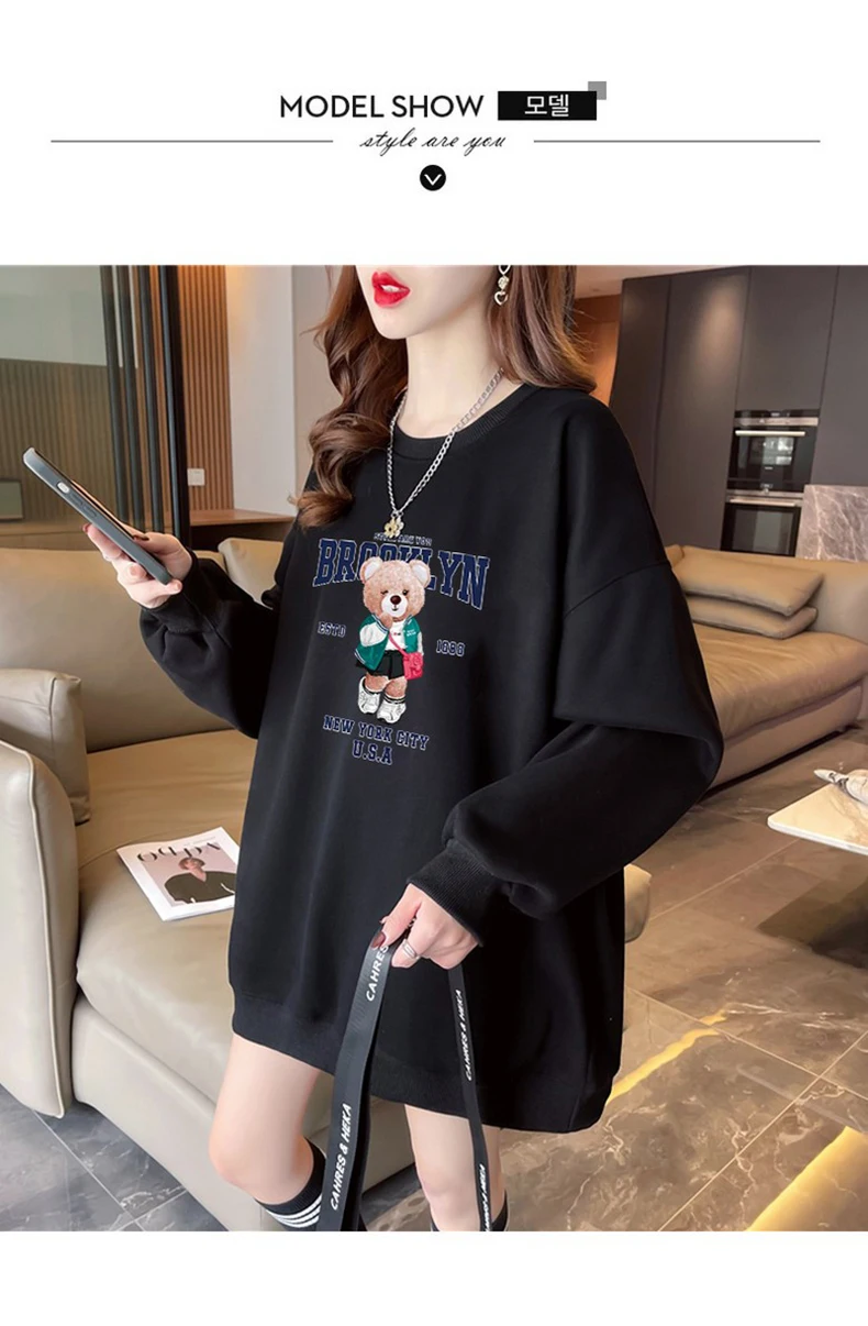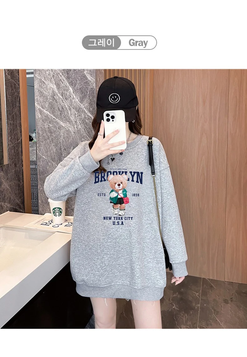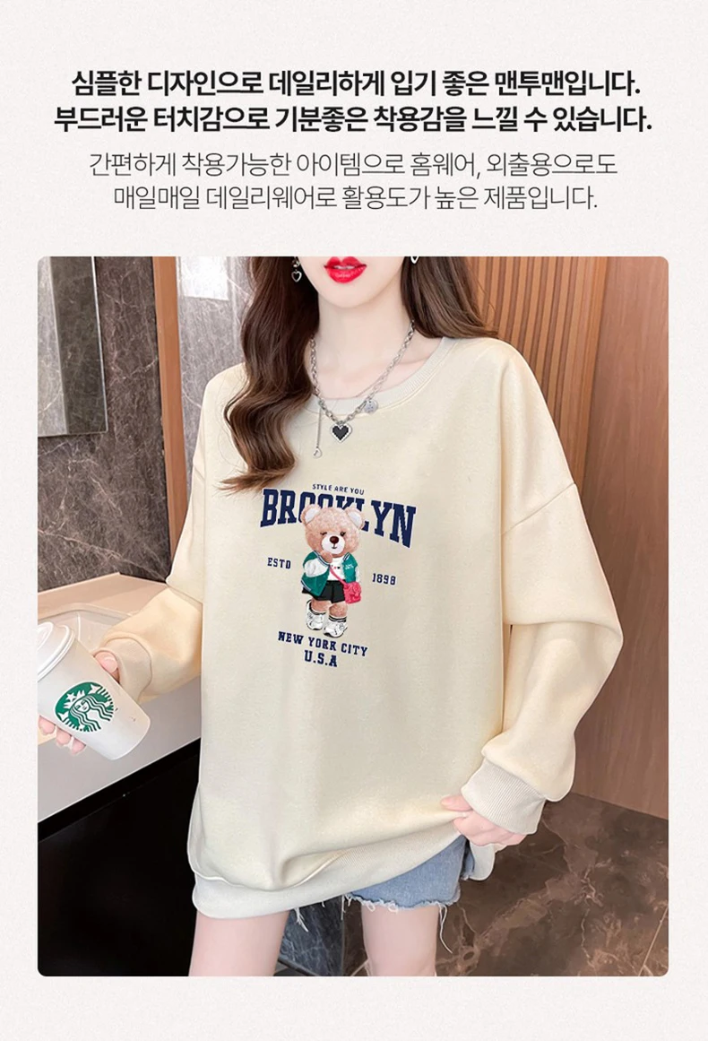 1+1(2장세트)스타일아유 여성용 유니크 베어프린팅 맨투맨 라운드넥 오버핏 320G면질 빅사이즈 가을겨울용 긴팔 티셔츠 TS3796