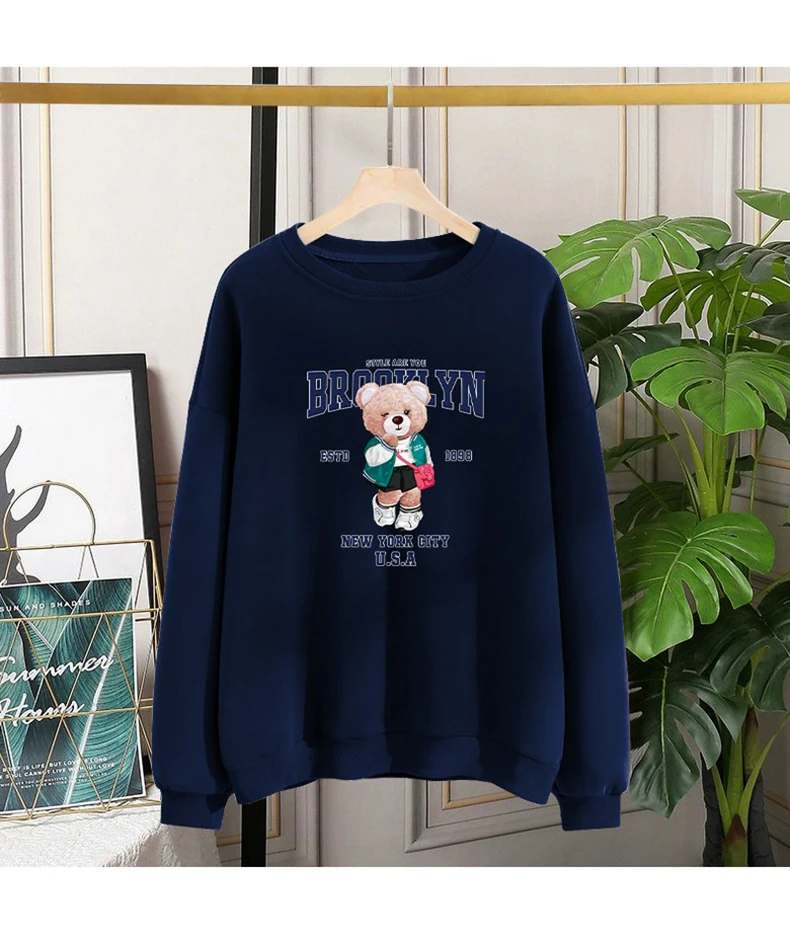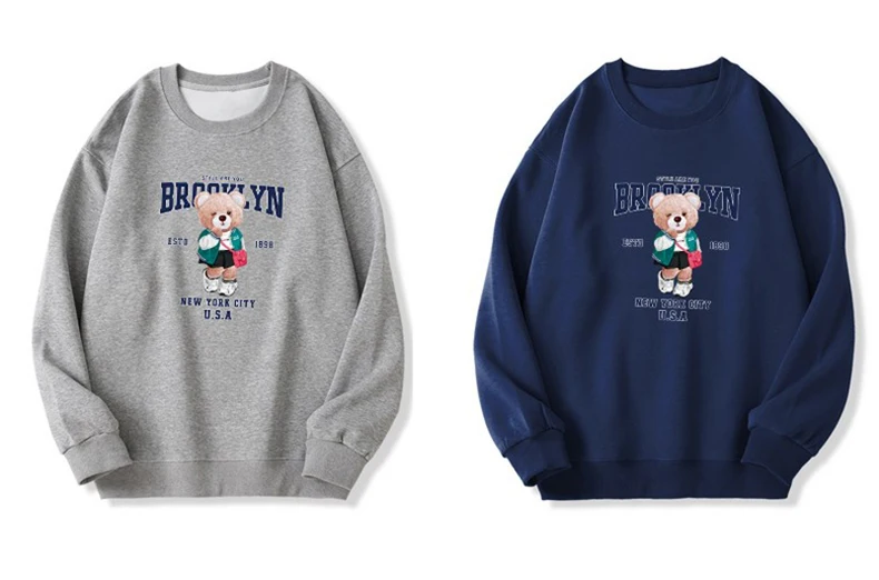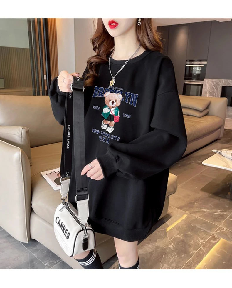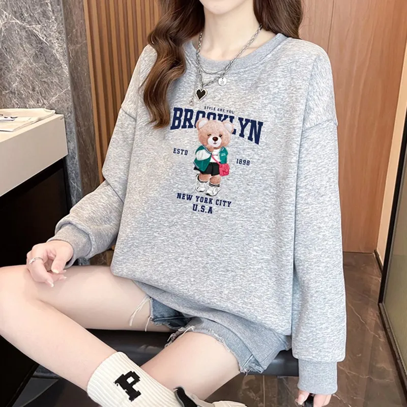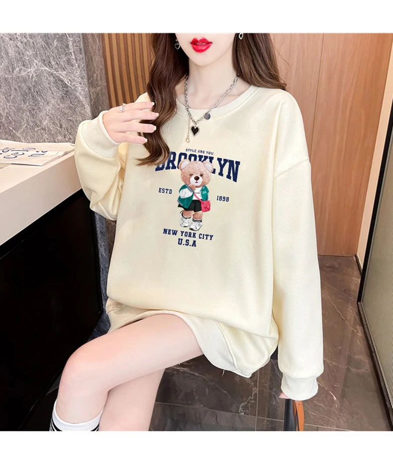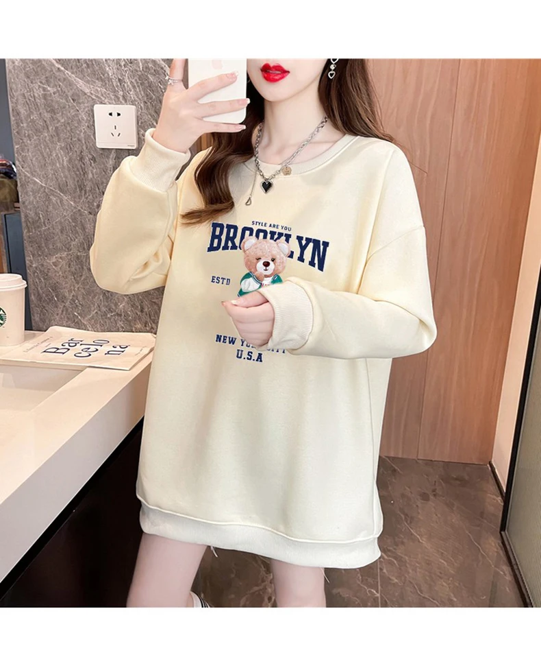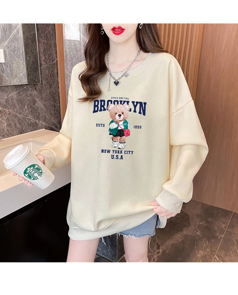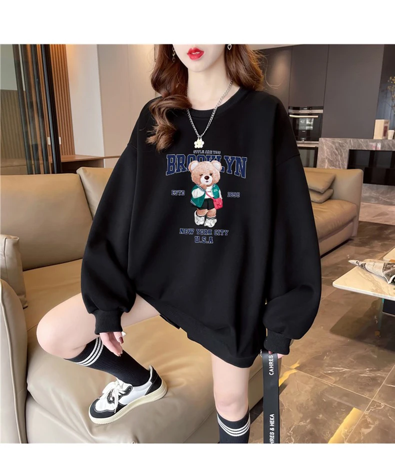 1+1(2장세트)스타일아유 여성용 유니크 베어프린팅 맨투맨 라운드넥 오버핏 320G면질 빅사이즈 가을겨울용 긴팔 티셔츠 TS3796