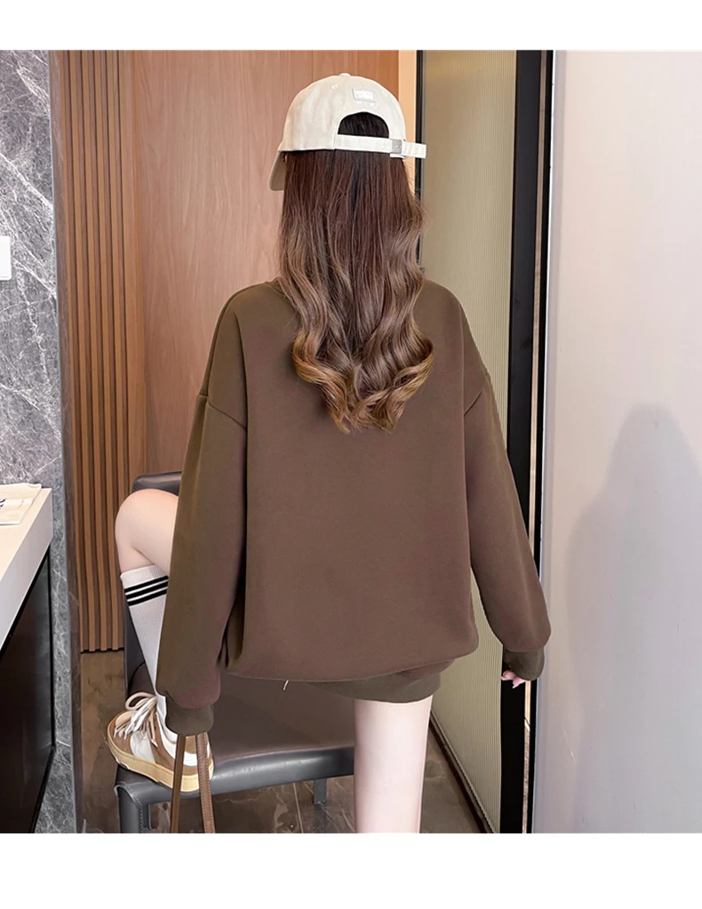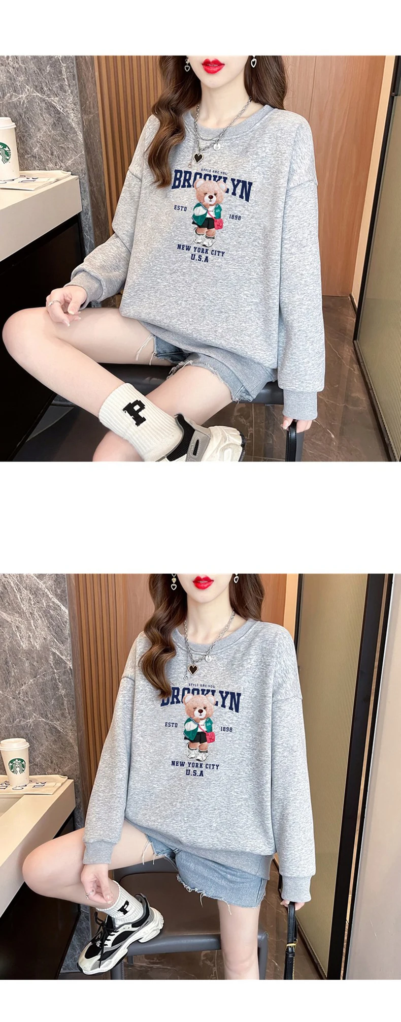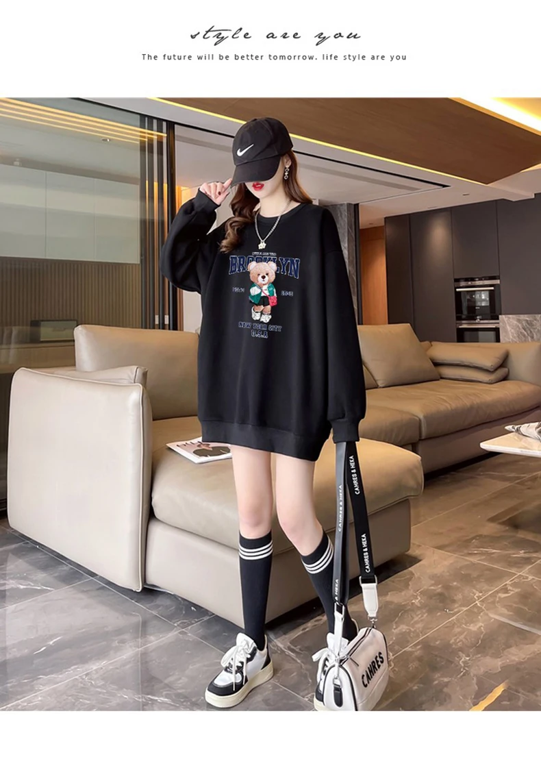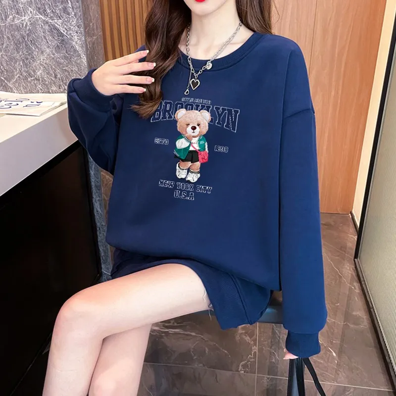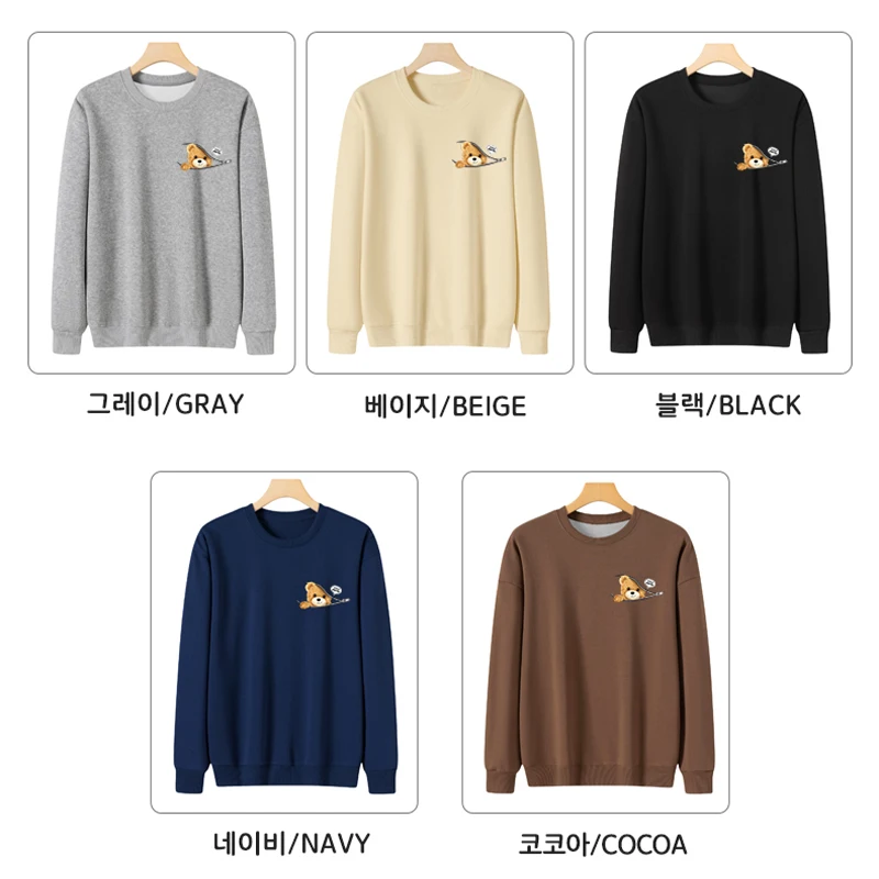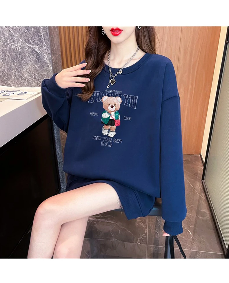 1+1(2장세트)스타일아유 여성용 유니크 베어프린팅 맨투맨 라운드넥 오버핏 320G면질 빅사이즈 가을겨울용 긴팔 티셔츠 TS3796