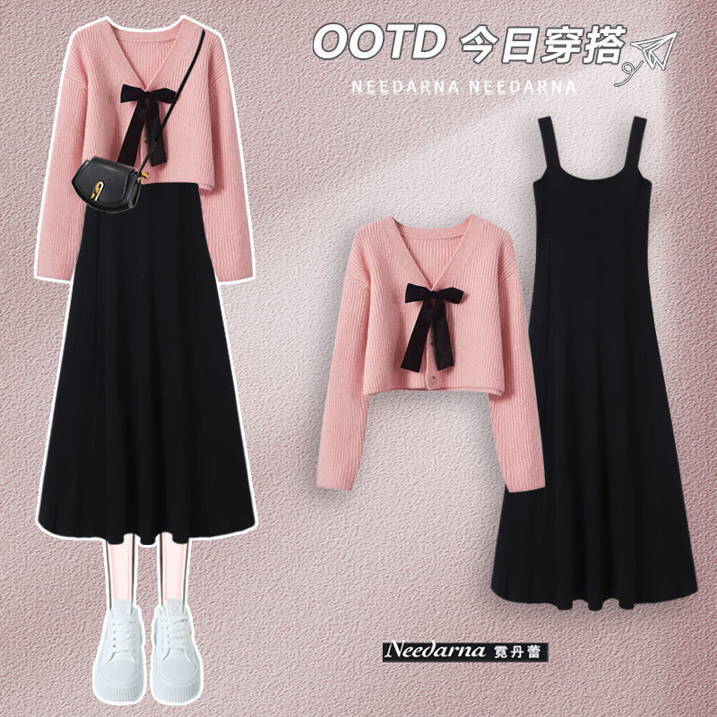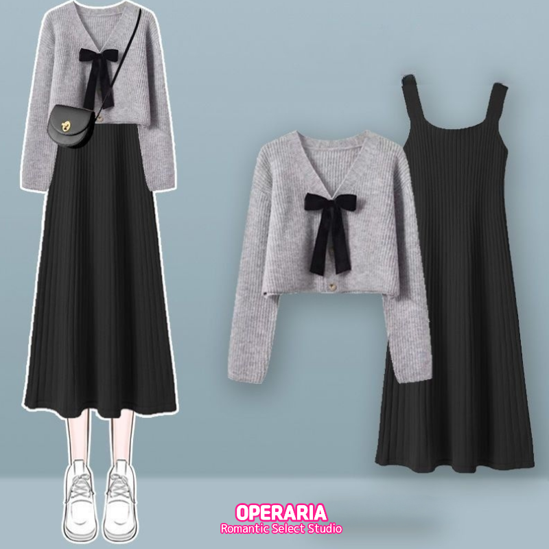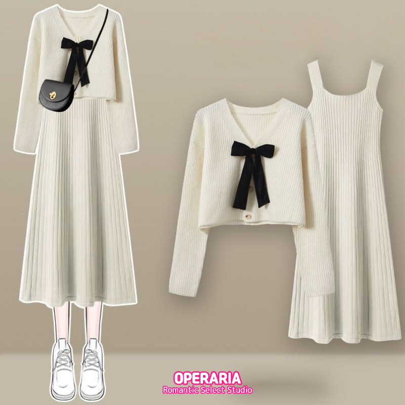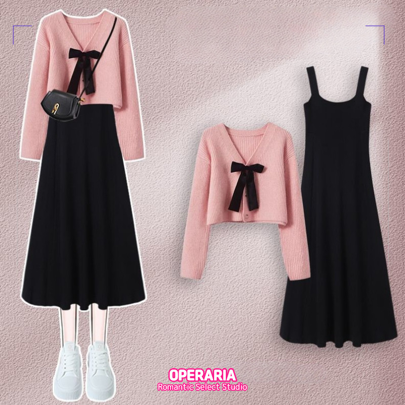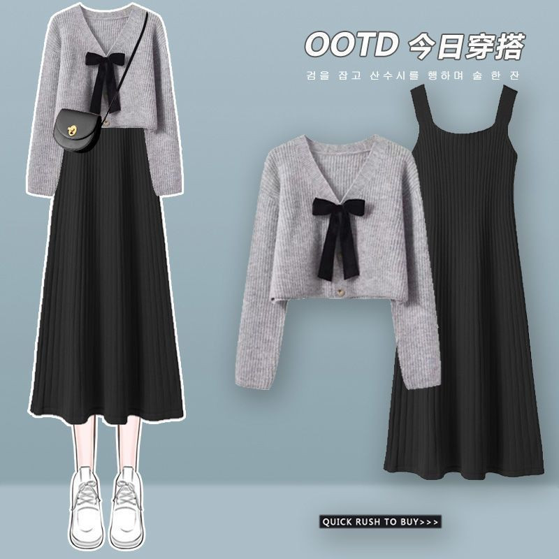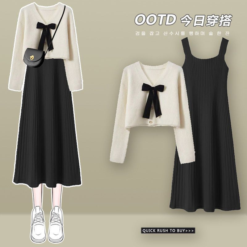 2025 가을겨울 신상 여성 니트 투피스 세트 | 여리핏 슬리밍 캐미솔 원피스+스웨터 세트