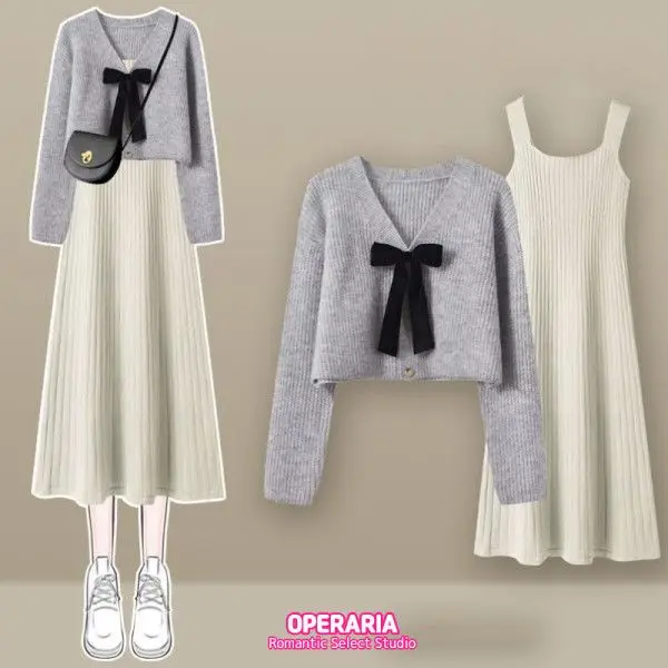 2025 가을겨울 신상 여성 니트 투피스 세트 | 여리핏 슬리밍 캐미솔 원피스+스웨터 세트