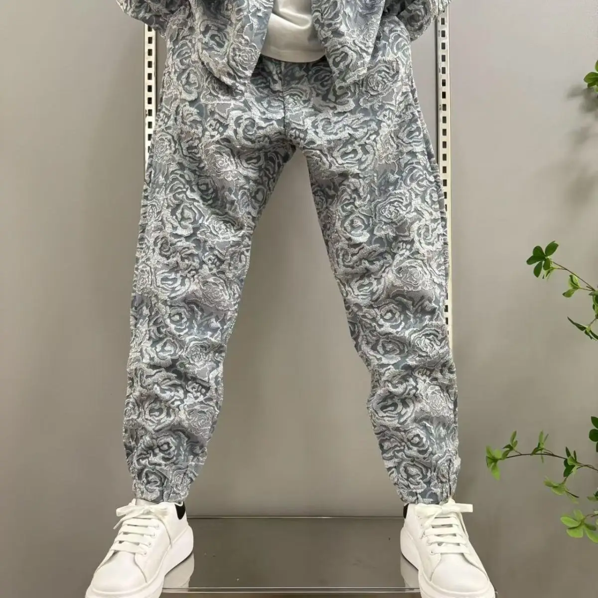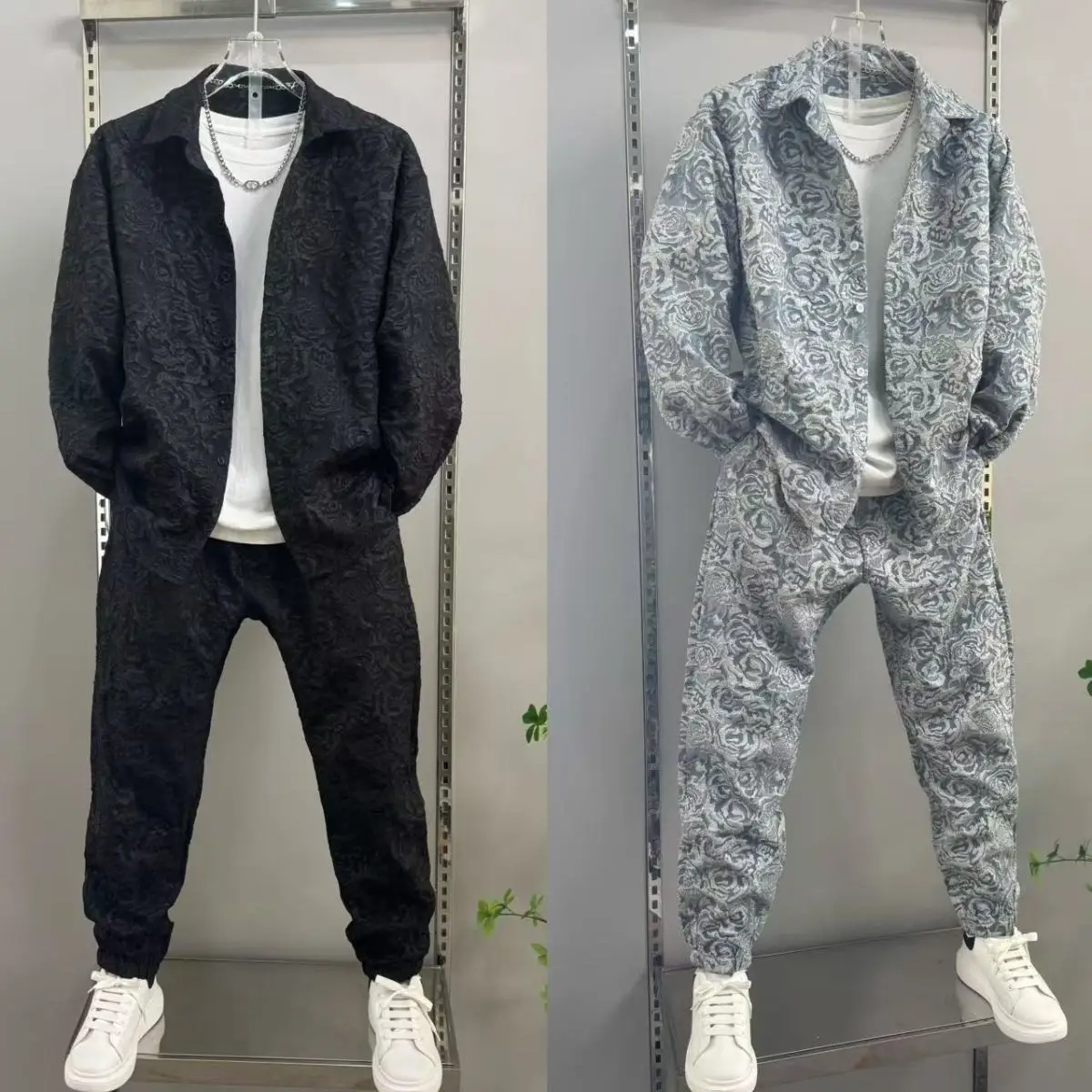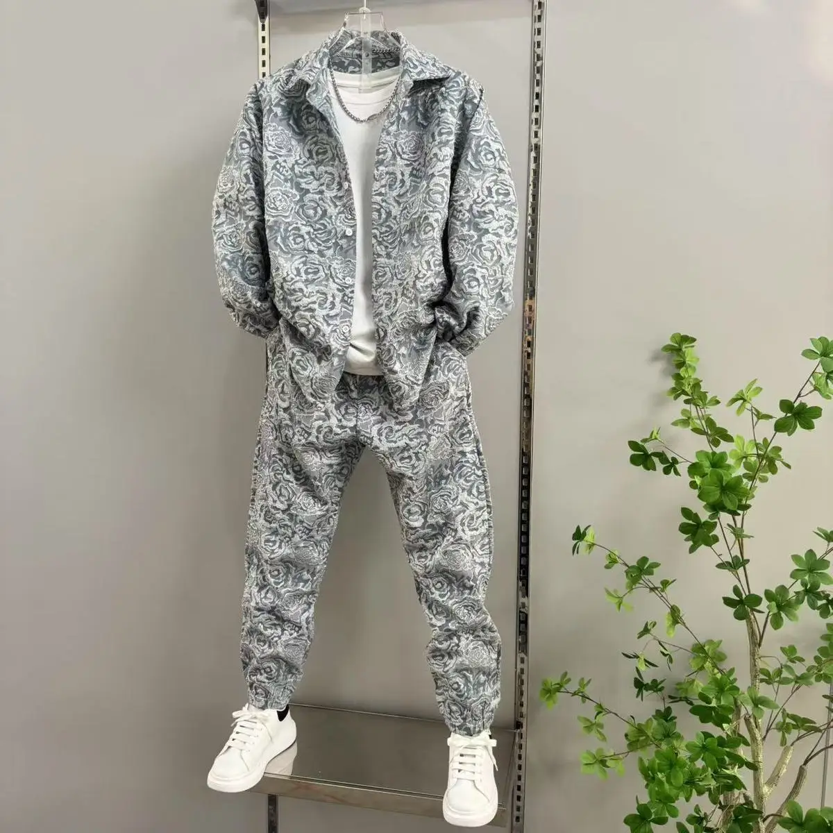 2025 신상 남성 캐주얼 패션 투피스 바지 세트, 스포티한 라펠 자카드 셔츠, 긴팔 봄가을 세트