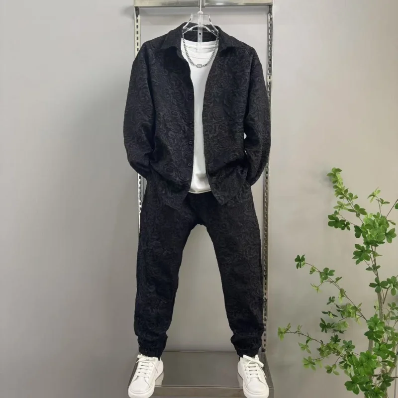 2025 신상 남성 캐주얼 패션 투피스 바지 세트, 스포티한 라펠 자카드 셔츠, 긴팔 봄가을 세트