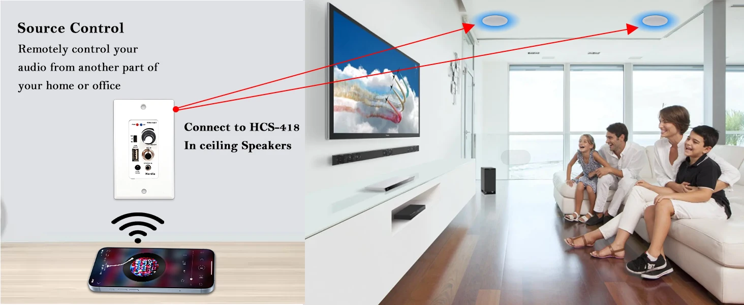 집이나 사무실의 어느 벽에나 이 홈 오디오 시스템을 설치하세요. 벽걸이형 앰프는 범용 표준 벽면 플레이트 크기를 갖추고 있습니다. HCS-418 천장 스피커와 연결하면 쉽게 접근할 수 있는 다양한 사운드 환경을 제공합니다.