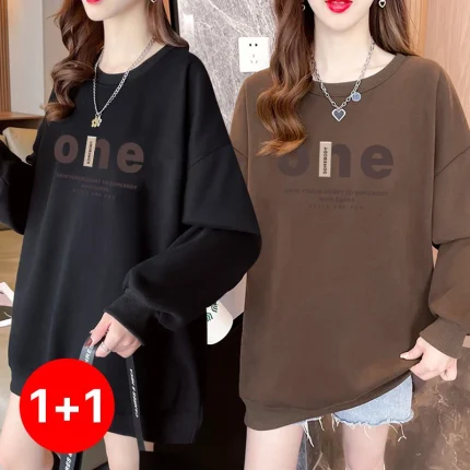 1+1(2장세트)스타일아유 여성용 맨투맨 빅사이즈 55~77 오버핏 가을겨울 ONE레터링 320G면질 긴팔 티셔츠 TS3798